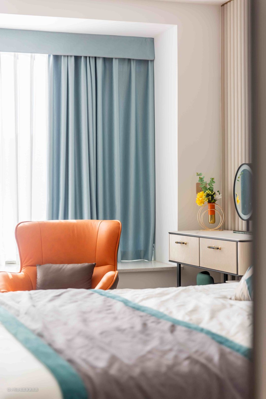 考虑到女主人早上有化妆的需求,小化妆桌便靠着阳台,也是因为自然光的化妆效果会更好。爱马仕橙的单人小皮椅将人包裹,舒适度绝对够够的,低调的原木色桌面简单大方。