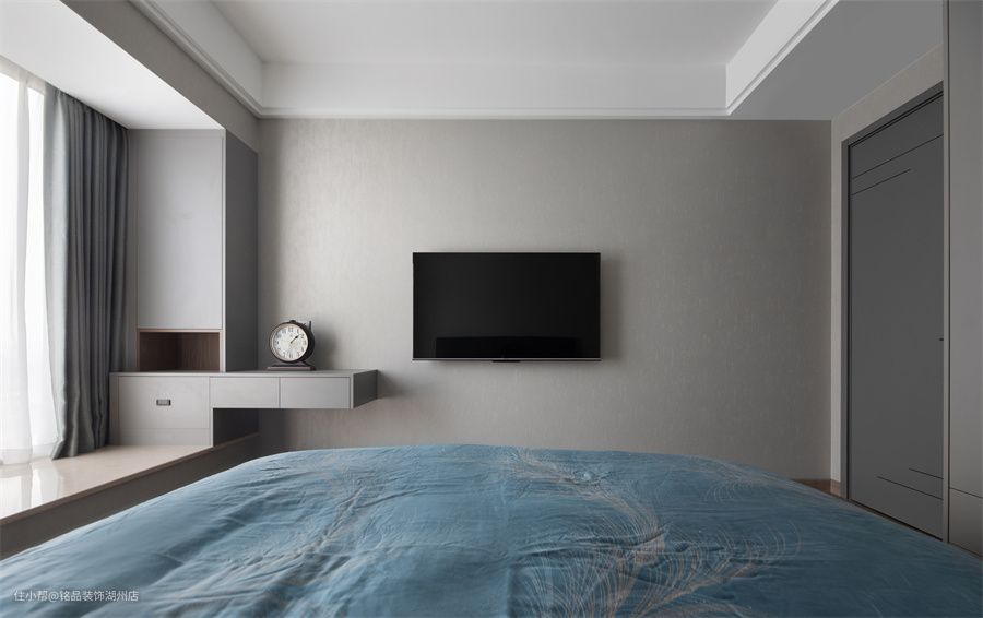 次卧面积也并不小偏冷色调些,硬装部分在阳台一侧设置储物柜,满足小物品的收纳,延伸出一个小平台方便放东西