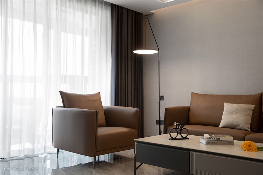 简约风客厅也可以用主灯,小巧吊灯并不会挤占空间,还可以配合顶部留白塑造艺术感,两侧内嵌灯带给吊顶带来光影层次感 电视墙用深色木纹板做全包,把背后的卧室门也可以较好的隐藏起来,在视觉上形成统一的整面背景墙,不会破坏整体营造的氛围 软装搭配从实用出发,电视柜和茶几选的是一套黑灰撞色设计,简单大方还不失设计感。挑选褐色皮革面沙发,丰富客厅风格,加一份轻奢感