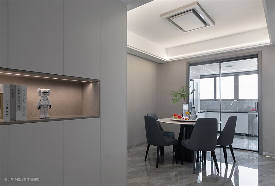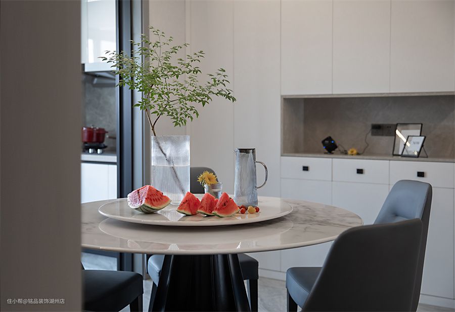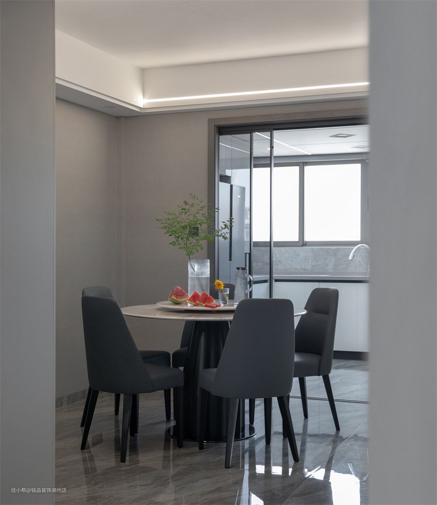 餐厅用玄关自然与客厅隔开,承上启下让两个空间不会产生割裂感。借厨房不错的自然光采光,让餐厅在白天也可以有通透明亮的感觉 定制整面餐边柜提供超多的储物功能,不止收纳就餐用具,也设计了大空间以容纳小家电。岩板桌面+皮革餐椅,轻松打造高品质就餐环境,双层旋转桌面也更方便使用