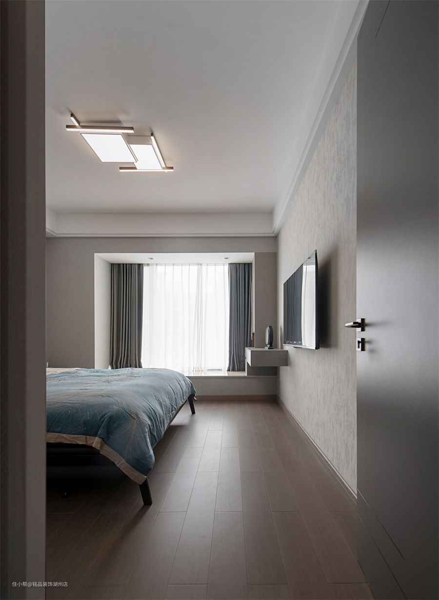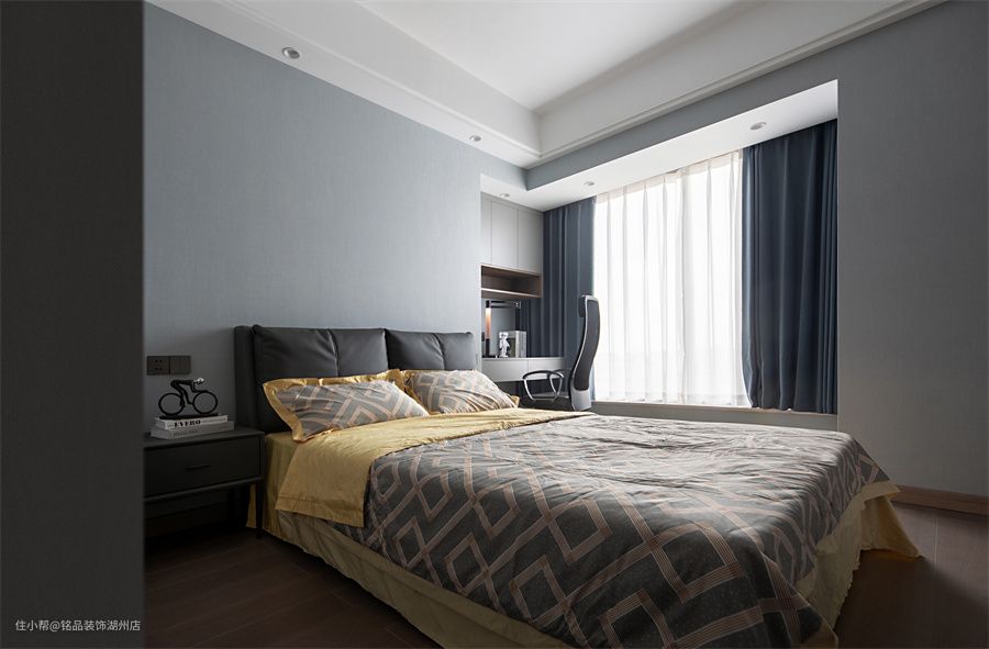 主卧淡雅蓝色墙壁,整体氛围舒缓适合休息睡眠。L形拐角将阳台区域延伸进来,可以搭建一个办公区方便日常简单办公或梳妆需求,做隐藏窗帘盒让外观利落清爽些