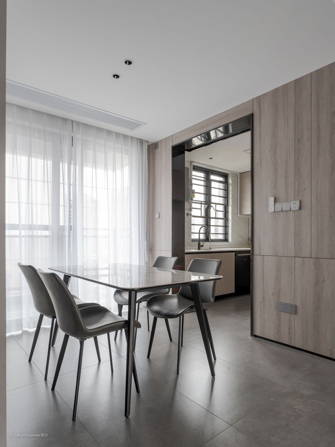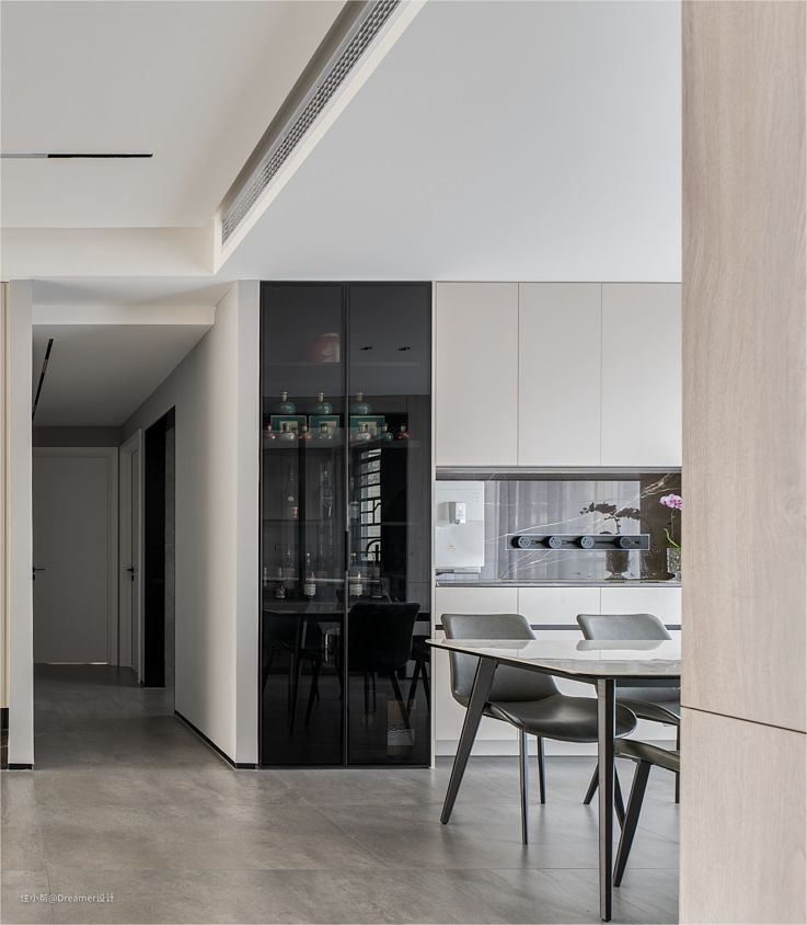 一侧是吊柜+地柜的餐边柜,黑色大理石的墙面,搭配黑色的玻璃展示柜,彰显高级的轻奢感。 #餐厅#餐边柜
