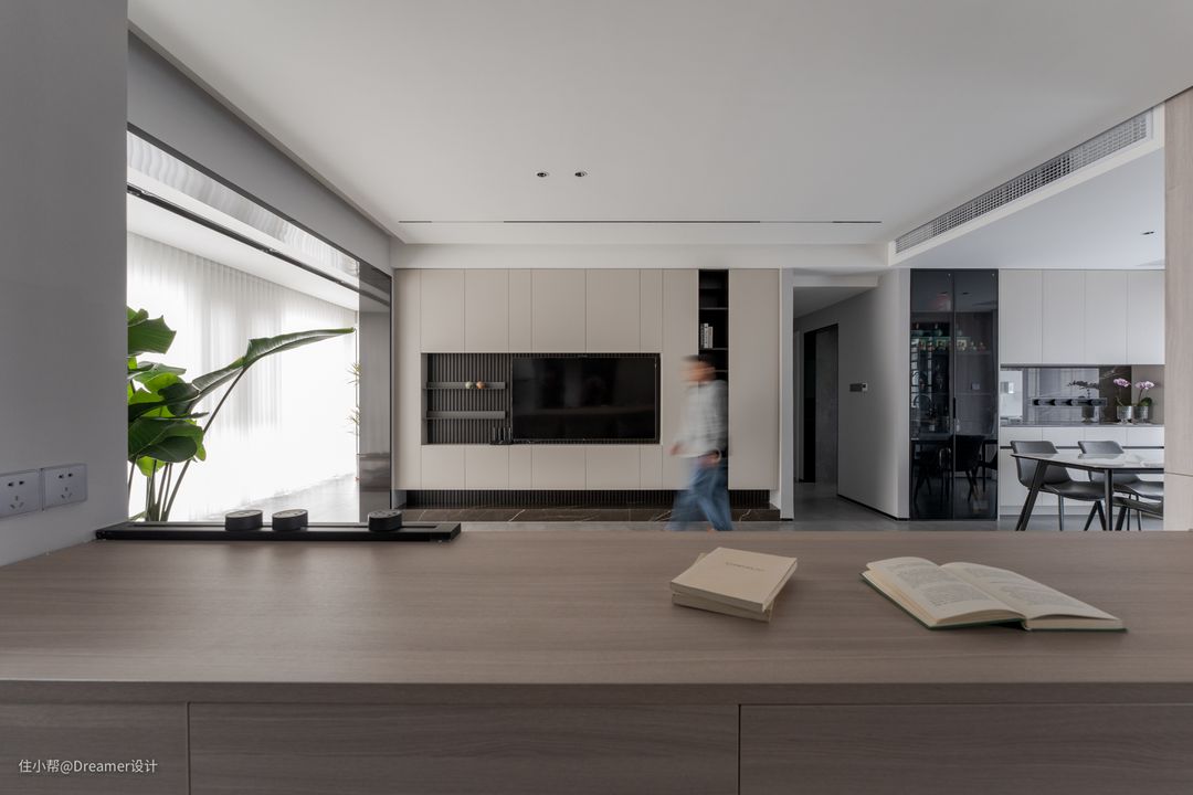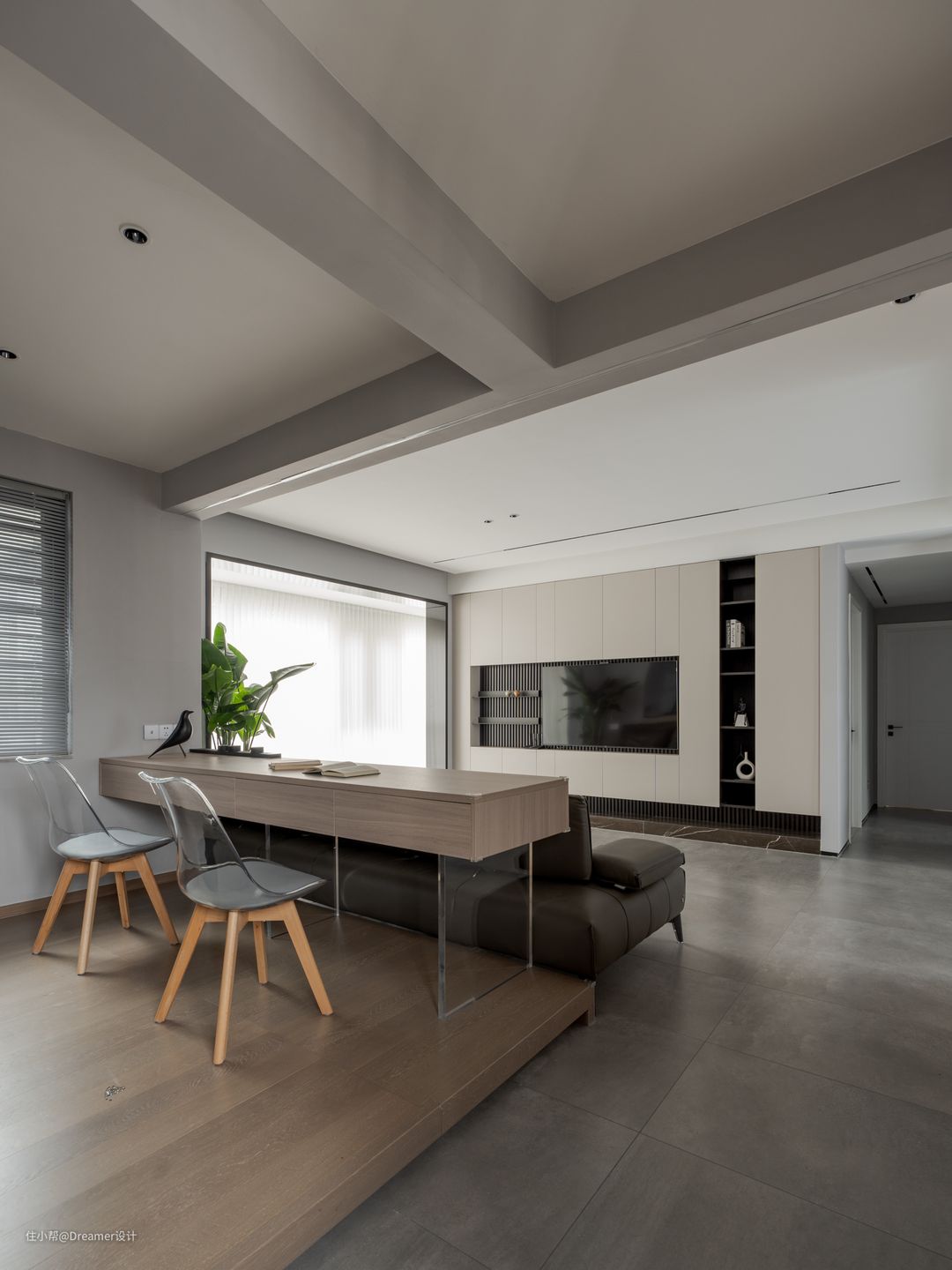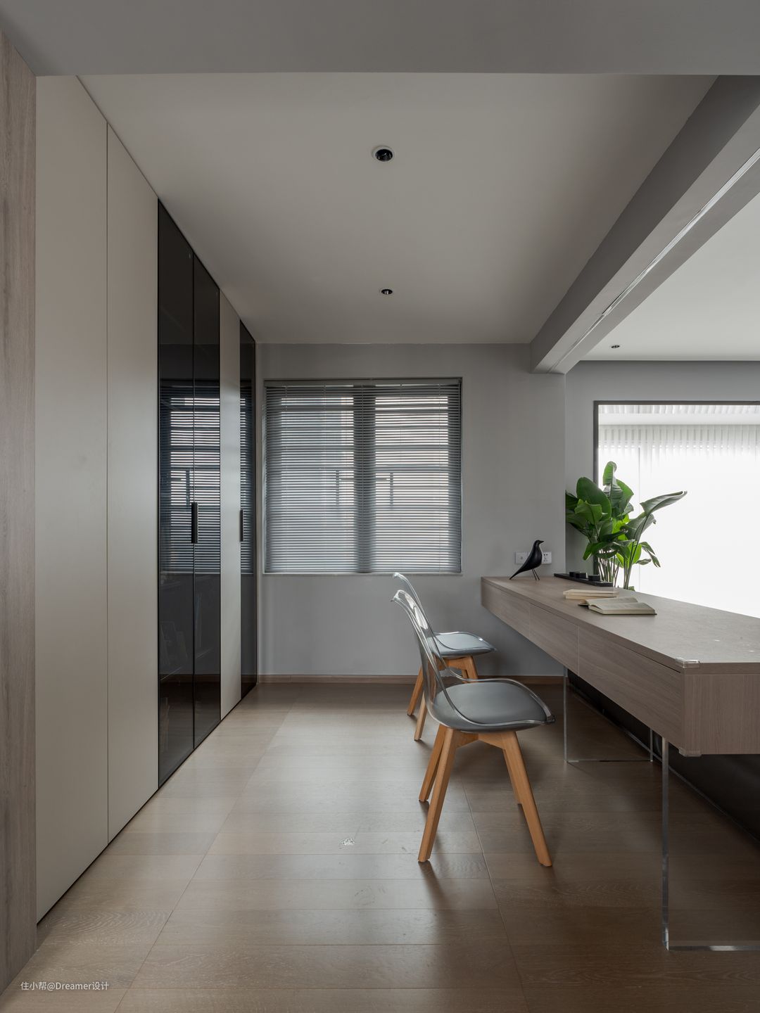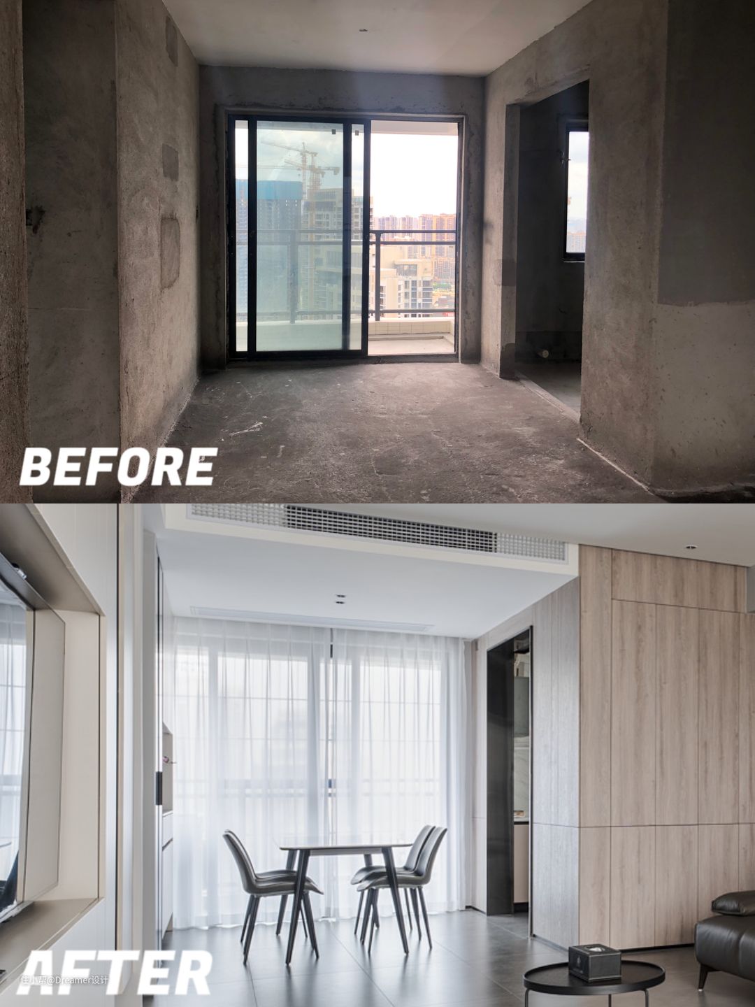 装修过程花了多长时间? 4个月 说说是什么给了你灵感,打造出现在这个作品的? 本案灵感主要是根据业主家庭成员和兴趣爱好设计的,男业主爱喝茶,我们就在阳台设计一个禅意茶室,女业主爱读书,就在入户处设计一个地台书房,考虑到孩子的亲子互动空间,就把阳台分为休闲阳台和生活阳台。 总的来说,一切灵感源于业主,所以说业主有什么需求尽管提,设计师都会尽量结合实际满足需求的。 你对这套作品最满意的地方在哪里,为什么? 改造后空间布局有效地被利用起来,采光也更顺畅,特别是入户处的地台书吧,既兼具了大人的办公阅读习惯,又考虑了亲子互动关系。 对平面布局做了哪些优化改动,为什么? 原始户型不需要多大拆改,把室外光线引进室内,并添加一些收纳柜满足业主的收纳需求。 1.拆掉入户处的书房墙面和靠近客厅一侧的墙,做成开放式的书房,使客厅实现多功能交互。 2.将儿童房墙往主卧卫生间方向外移,增大空间使用面积。 3.厨房靠玄关侧的非承重墙往里移,增加一排通顶的收纳柜。 4.打掉公共卫生间门处的一半非承重墙,并设计成干湿分离,让空间利用率更高。 5休闲阳台联通客厅与次卧,回字形动线,活动自由舒畅。 6.通过调整床头朝向,解决风水问题的同时,增加衣柜的收纳量。 关于异地对接设计及施工问题 业主是长时间出差在外地,很少有时间回来深圳对接设计问题,从一开始咨询就在线上会议共享屏幕沟通方案,到实施设计方面设计师经常到现场与业主视频会议,关于材料材质方面我们寄小样给到业主感受材质的质感,因为业主的信任本套设计顺利的完成