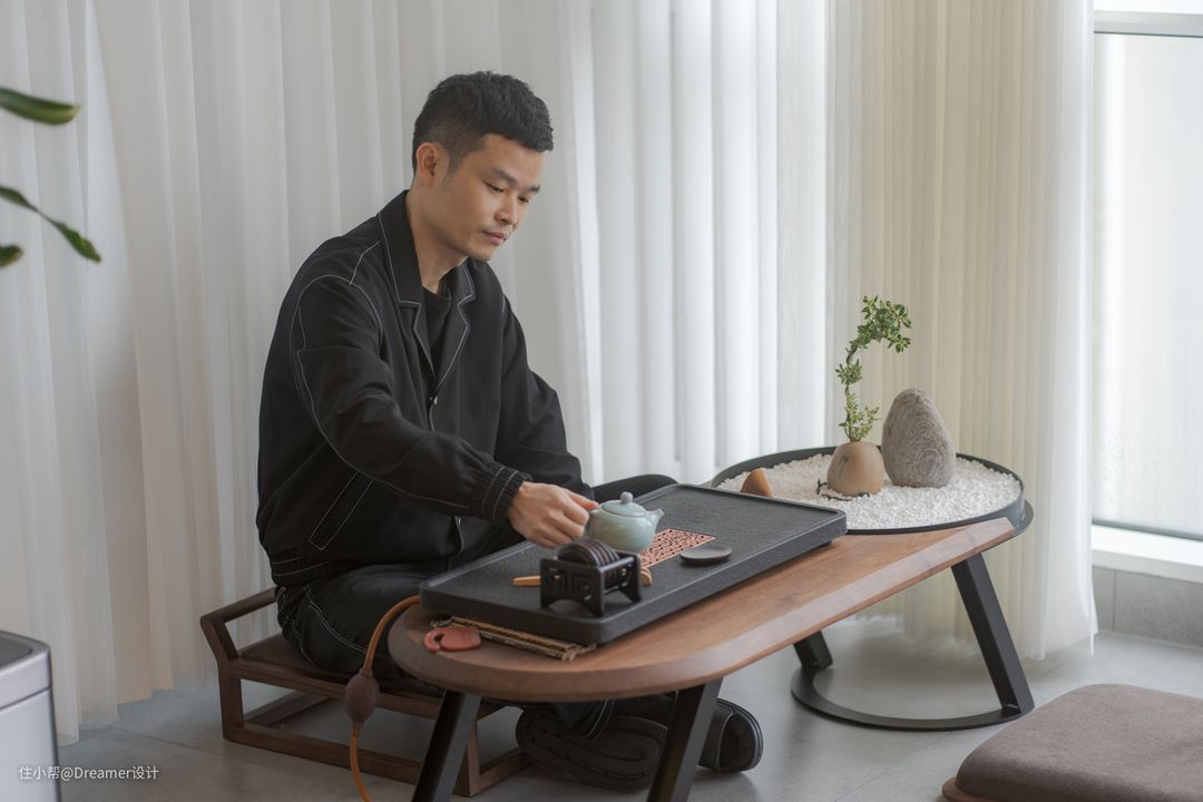 结合男业主喝茶的爱好,阳台一侧做个禅意的茶室,胡桃木的桌椅,搭配黑色纹理质感的茶盘,抚平内心的焦躁。 #阳台#茶室