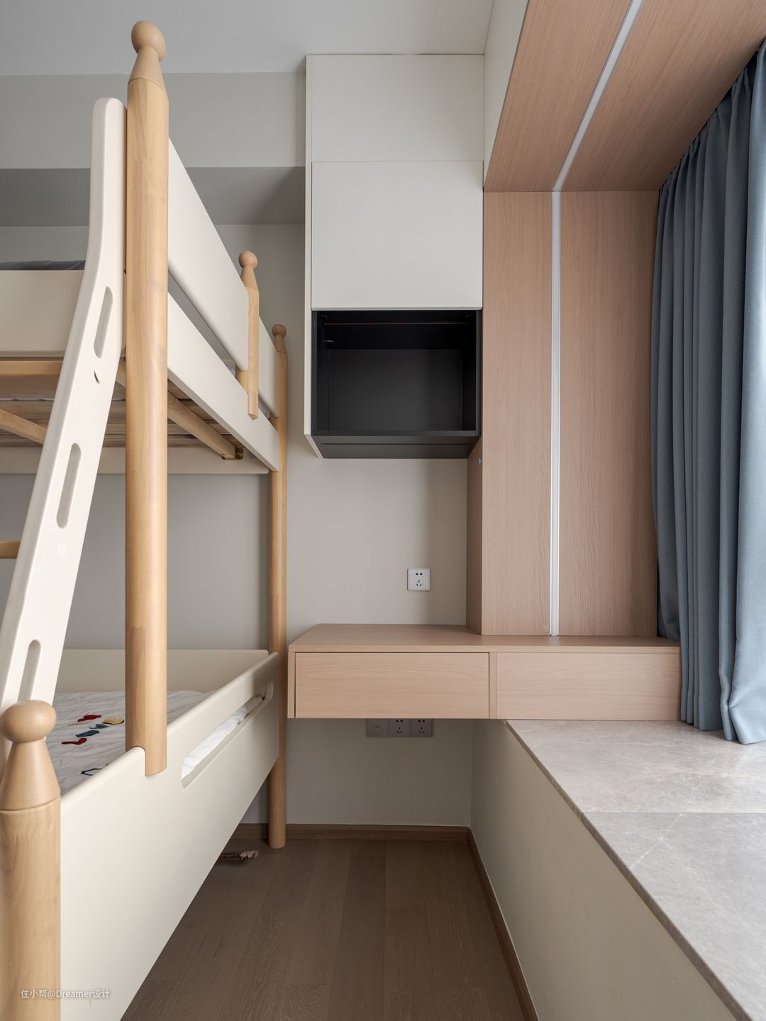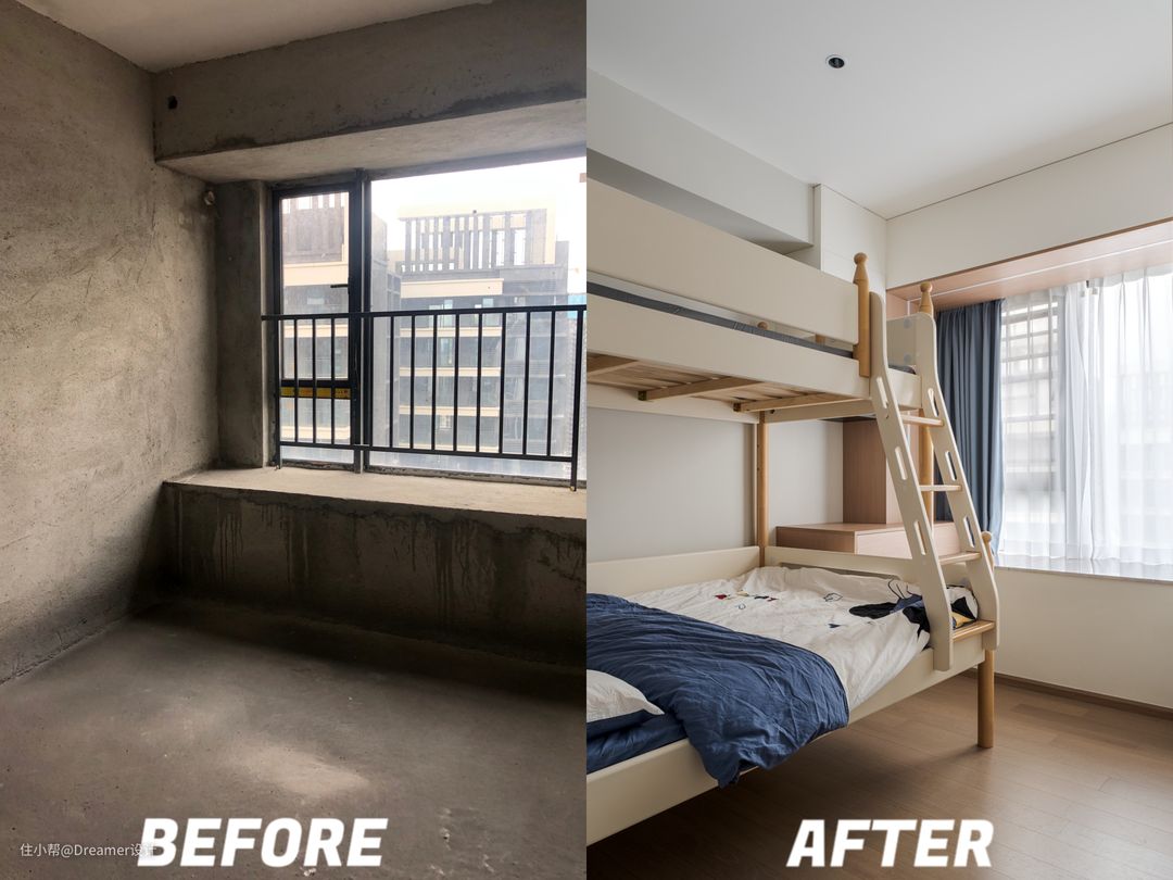 原始面积不够做一个卧室,将儿童房一侧墙往主卧卫生间方向外移,增大空间使用面积。 #儿童房 #飘窗柜