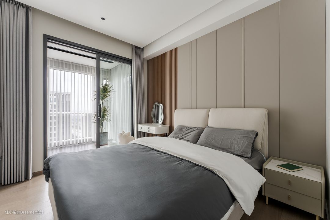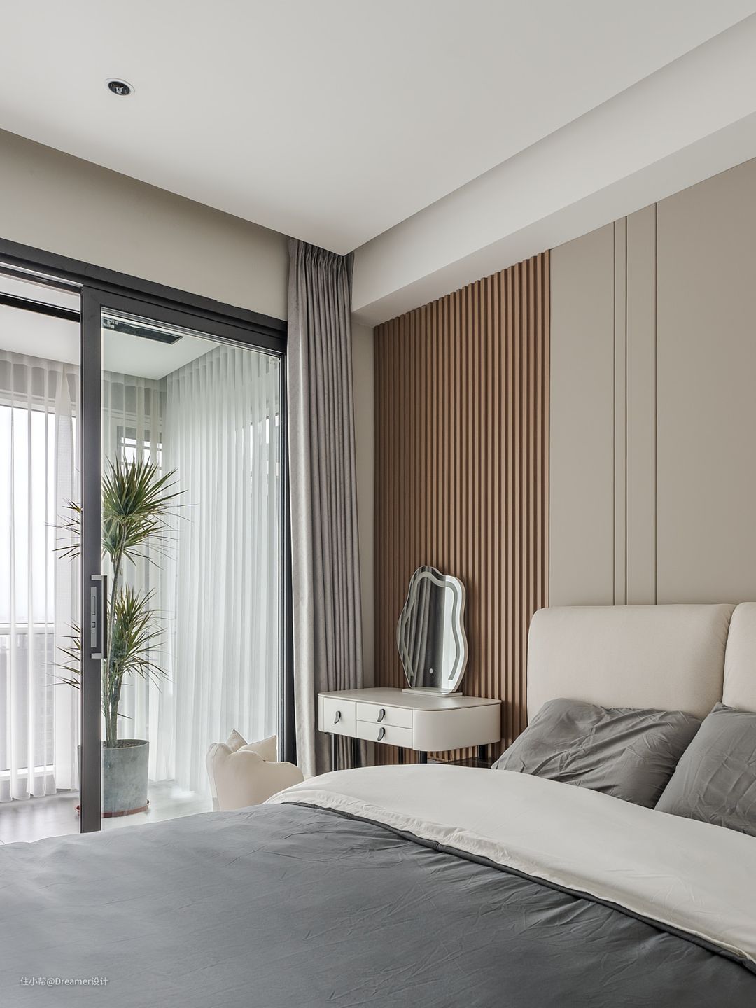 落地窗的设计,与客厅相通的阳台,可以随意穿行。床头背景的格栅,搭配护板墙的线条,延伸了视觉效果,提升视觉高度。 #次卧#阳台#格栅#护板墙