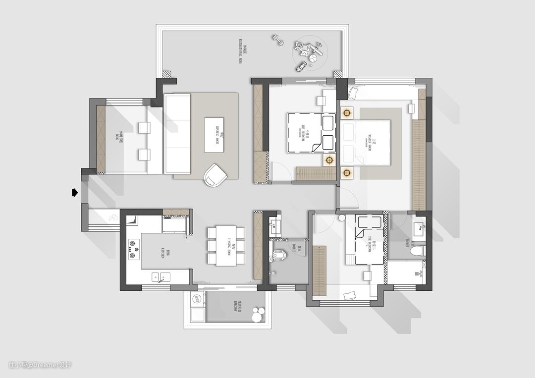 不需要多大拆改,把室外光线引进室内,并添加一些收纳柜满足业主的收纳需求。 1.拆掉入户处的书房墙面和靠近客厅一侧的墙,做成开放式的书房,使客厅实现多功能交互。 2.将儿童房墙往主卧卫生间方向外移,增大空间使用面积。 3.厨房靠玄关侧的非承重墙往里移,增加一排通顶的收纳柜。 4.打掉公共卫生间门处的一半非承重墙,并设计成干湿分离,让空间利用率更高。 5休闲阳台联通客厅与次卧,回字形动线,活动自由舒畅。 6.通过调整床头朝向,解决风水问题的同时,增加衣柜的收纳量。 #平面方案