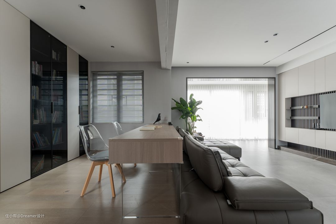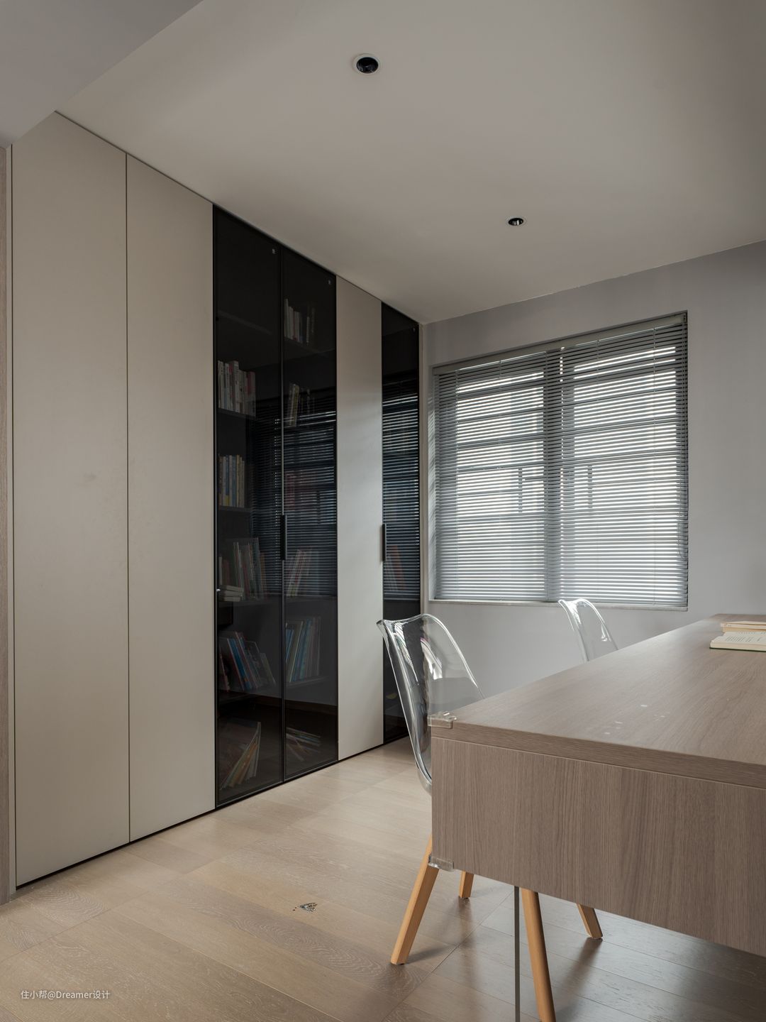 休闲书吧采用悬浮地台的设计,给足了业主仪式感,书桌搭配亚克力材质形成漂浮的感觉。书柜采用亚克力层板,穿插玻璃柜门,增加空间的通透感。 #书柜#书架