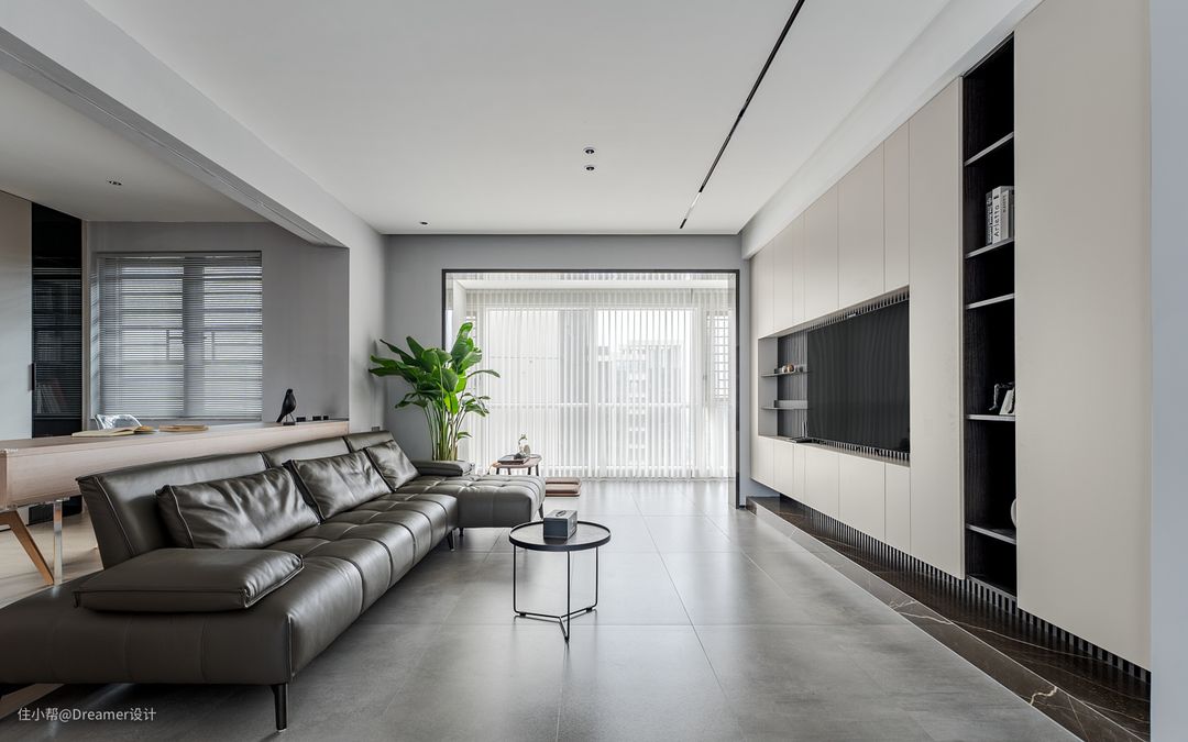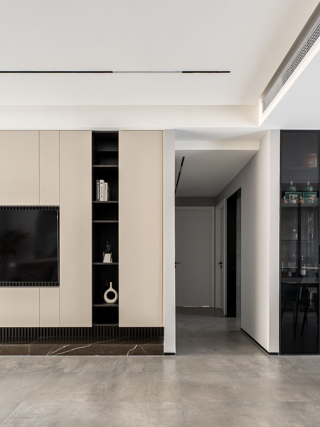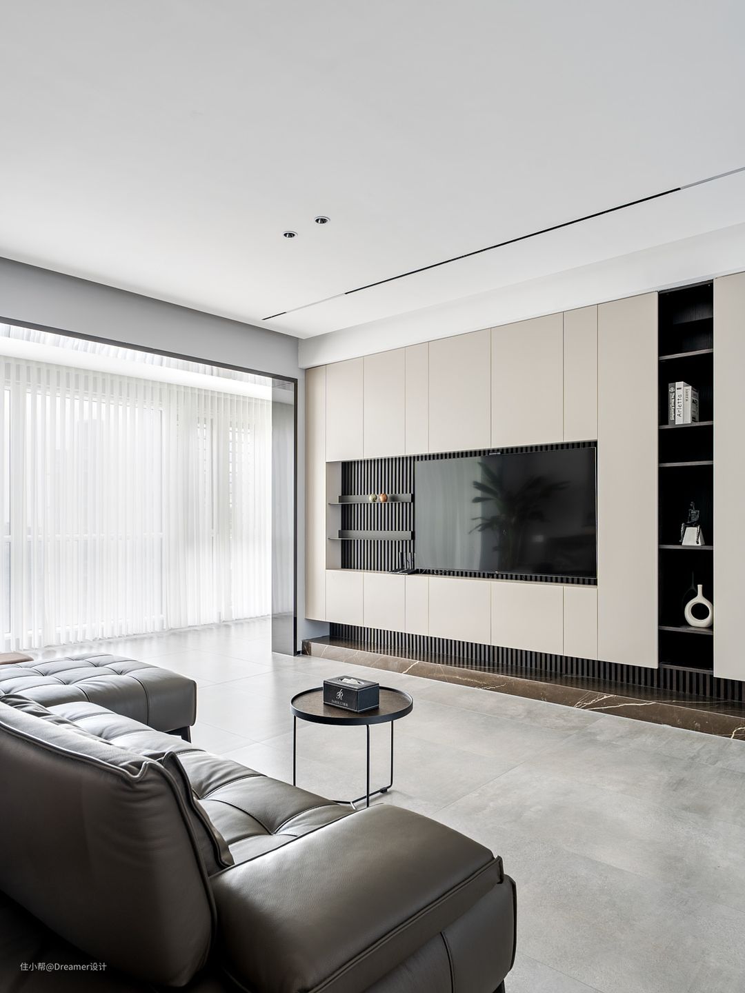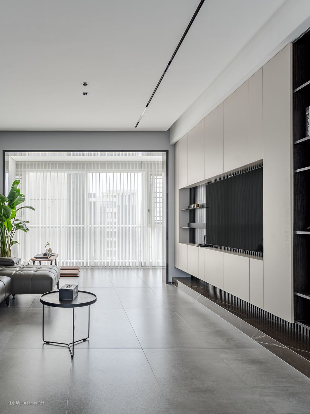 电视墙做了深浅柜的搭配,大理石、不锈钢、烤漆,不同材质的灰色组合在一起,增加空间的层次感。 #电视柜#电视背景墙