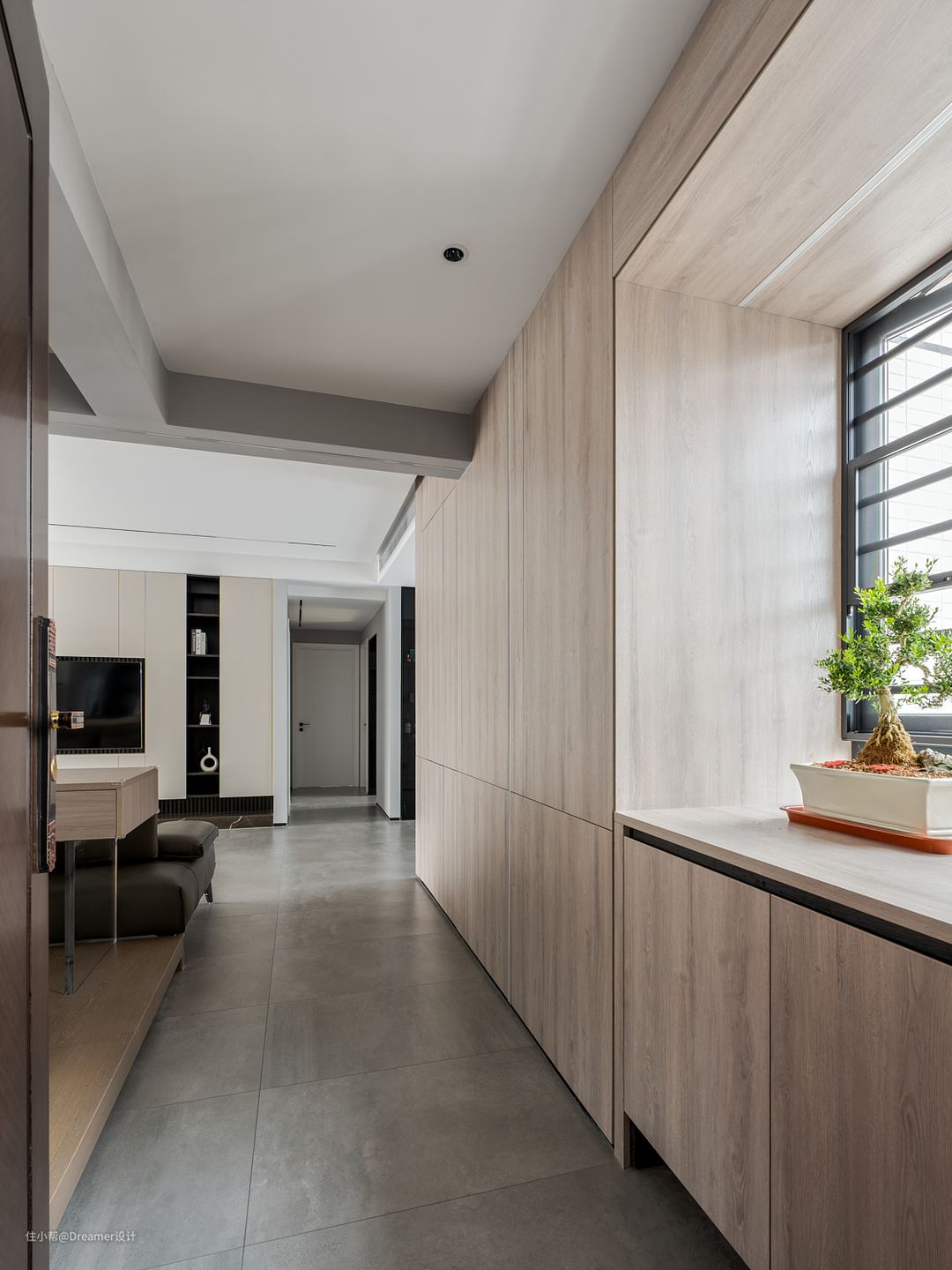 一入户便是三段式的玄关柜设计,底部留20公分的懒人踢,中空的开放台面,便于日常出门进门的小物件放置。 #玄关#玄关柜#收纳