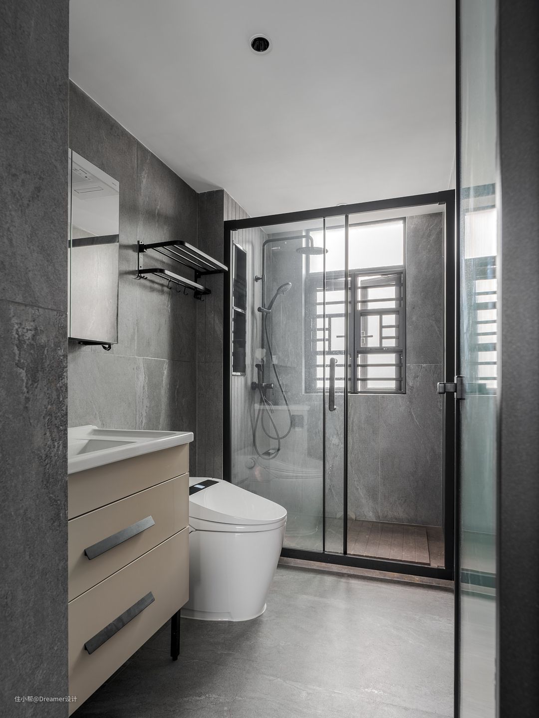 主卧卫生间采用干湿分离设计,淋浴房中间设计了地砖防滑拉槽,加速地面排水不会造成积水的现象,且比单调的瓷砖更有形式感。 镜柜的设计,既满足整理仪表照镜子的需求,也能收纳日常的洗漱用品。 #卫生间#干湿分离#防滑拉槽#淋浴区