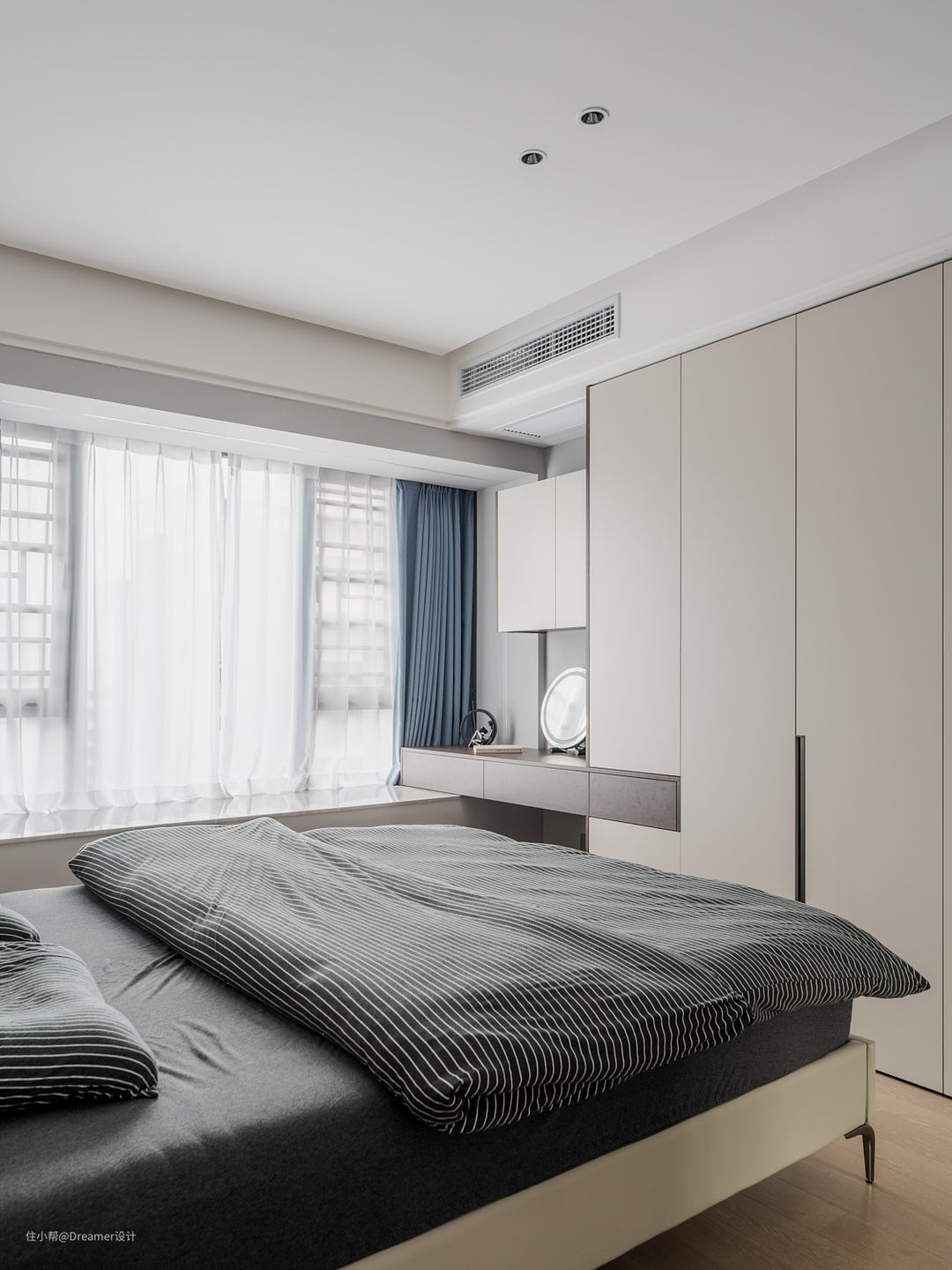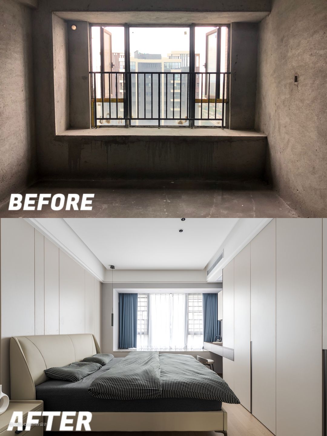 床尾做满一门到顶的衣柜,梳妆台连接了卡座飘窗和衣柜,让空间更加统一。 #卧室#卡座#飘窗#前后对比