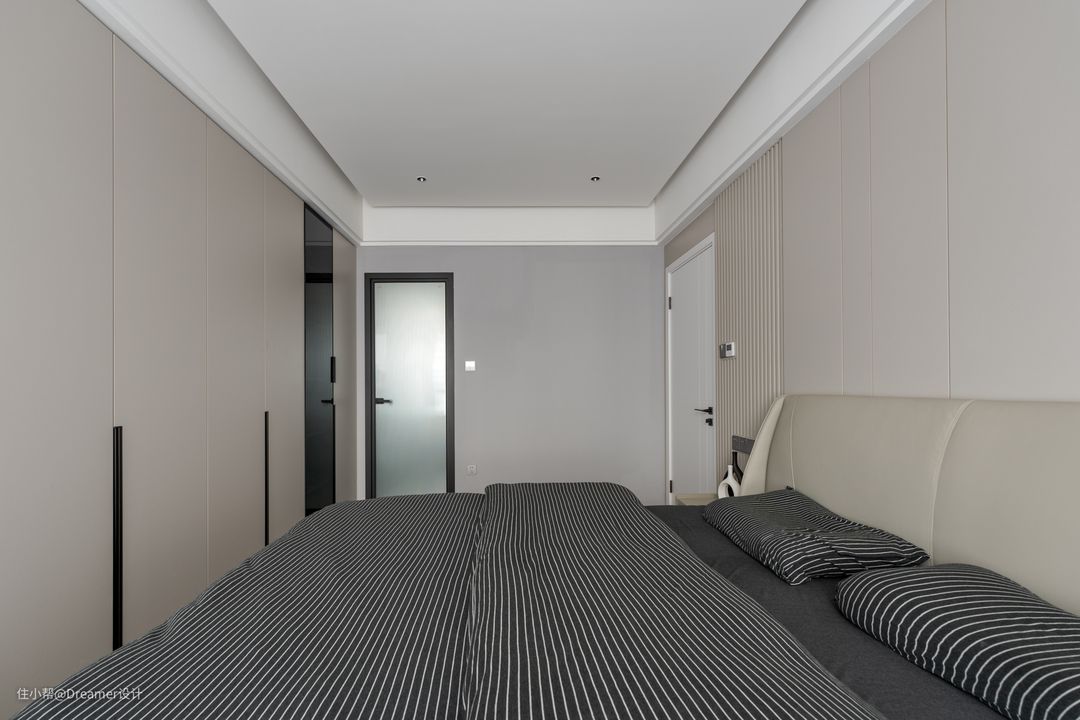 按照平常人的习惯,卫生间门对着床头是不行的,我们也考虑到这个风水问题,就把床头调整朝向,并在床尾设计一门到顶的收纳柜。 卫生间门用长虹玻璃,实现透光不透影的效果,关上就看不见里面杂乱。 #主卧#卫生间