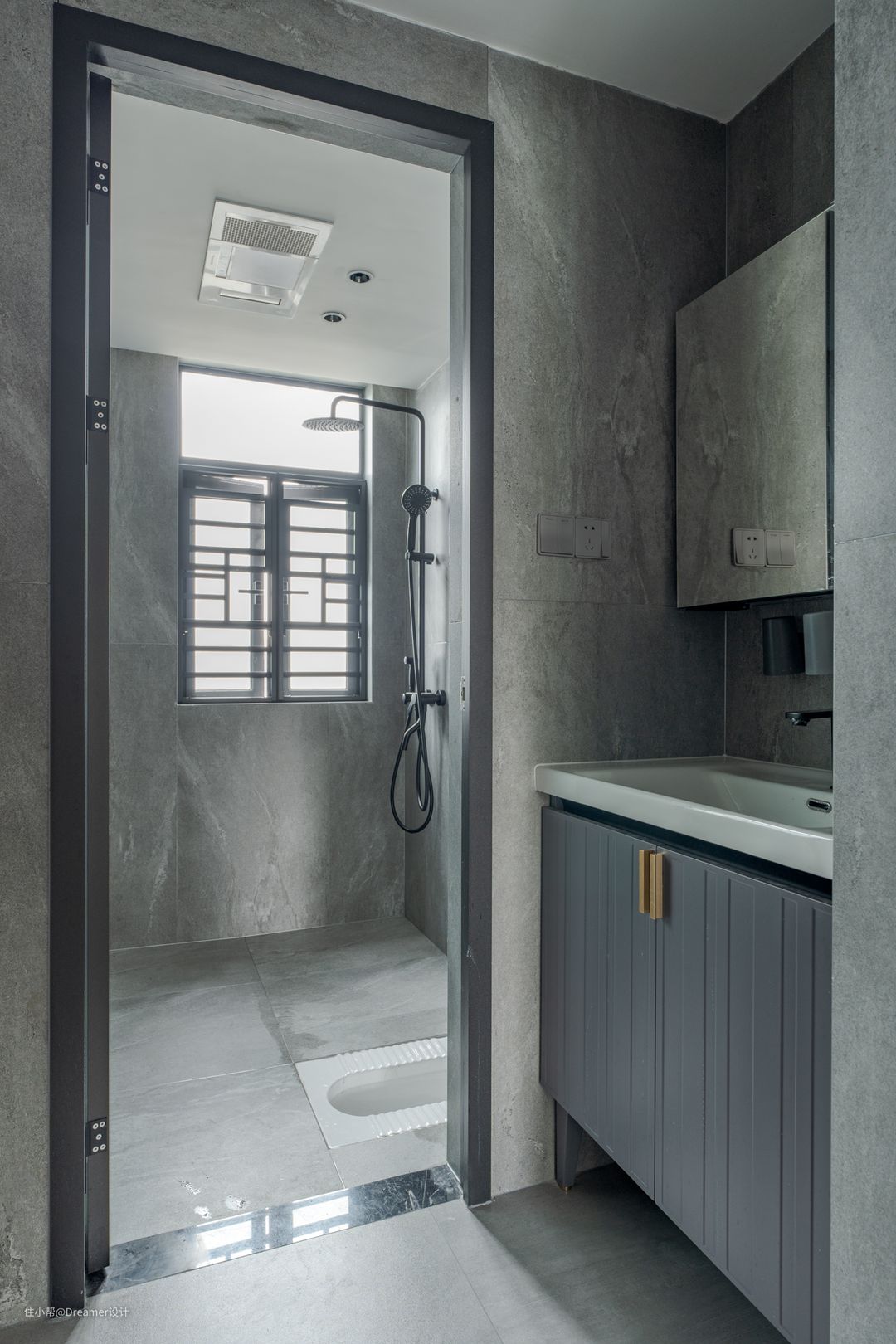 应业主需求,把公卫的马桶替换成蹲厕,减少与人体的接触面,更加卫生。细脚悬空浴室柜,清洁打扫方便。