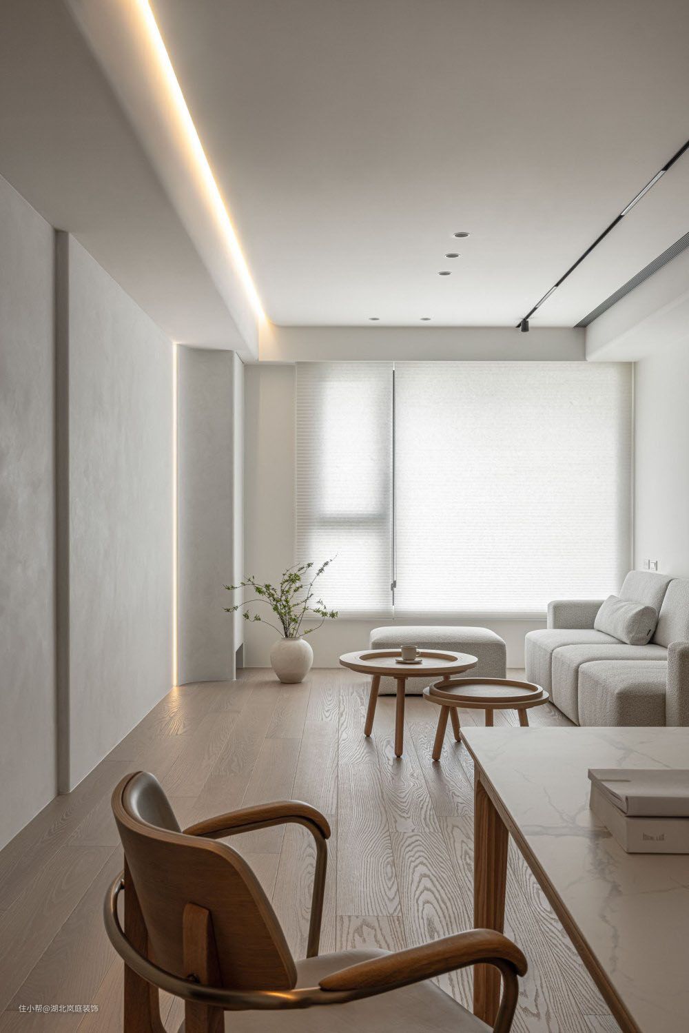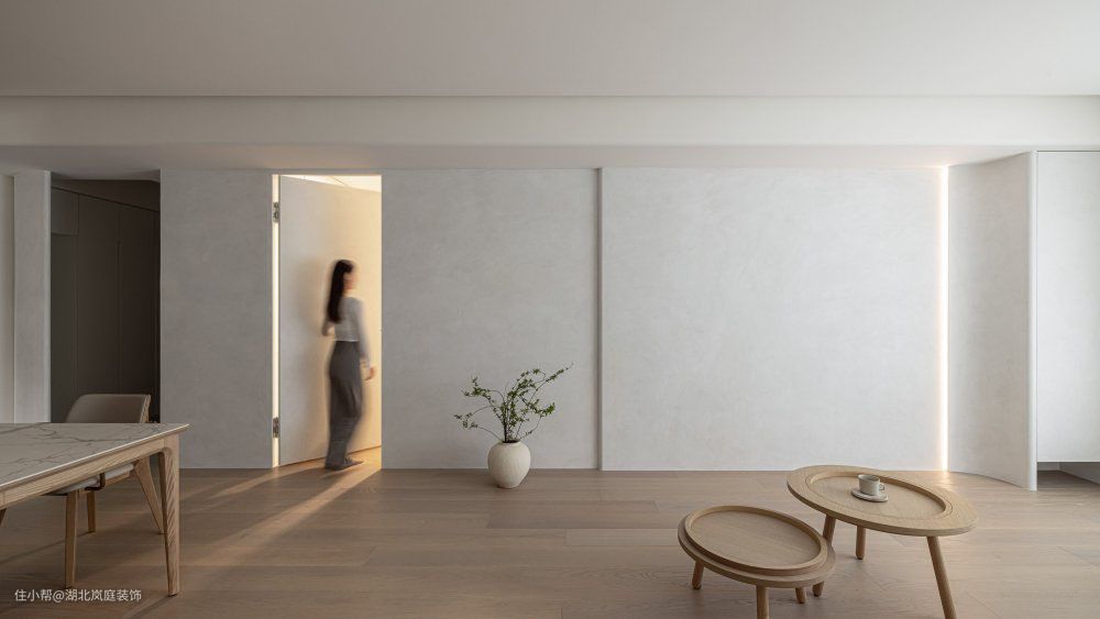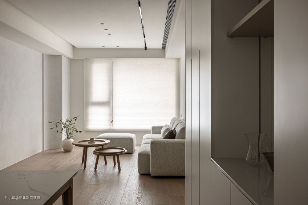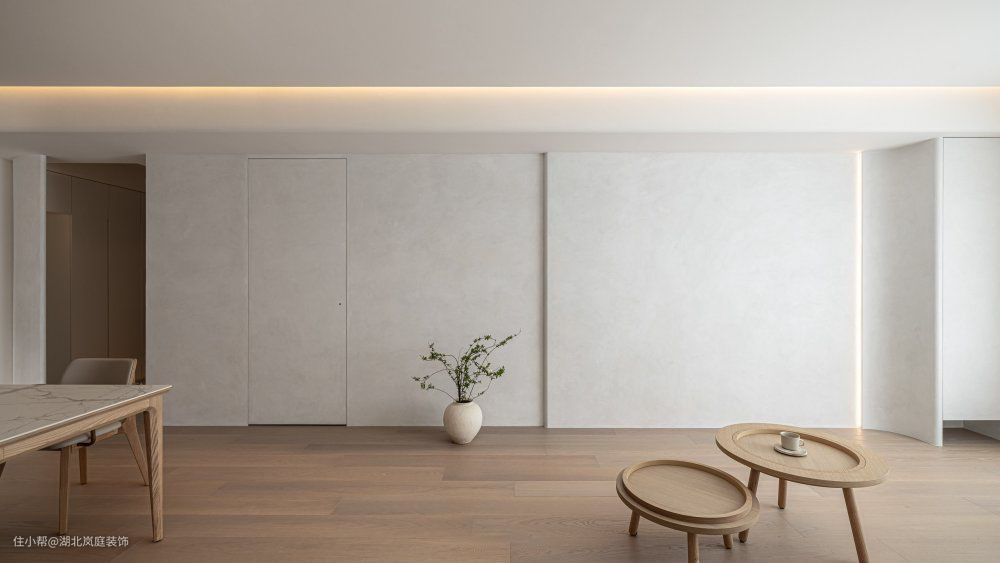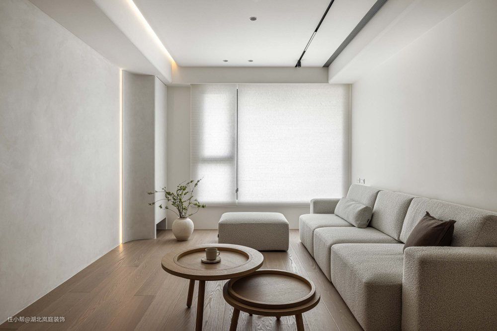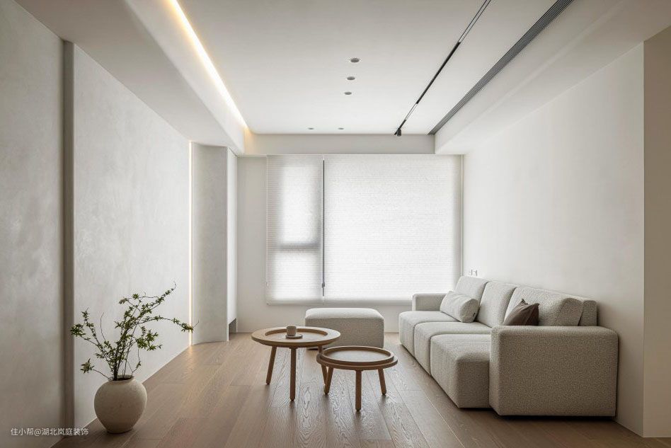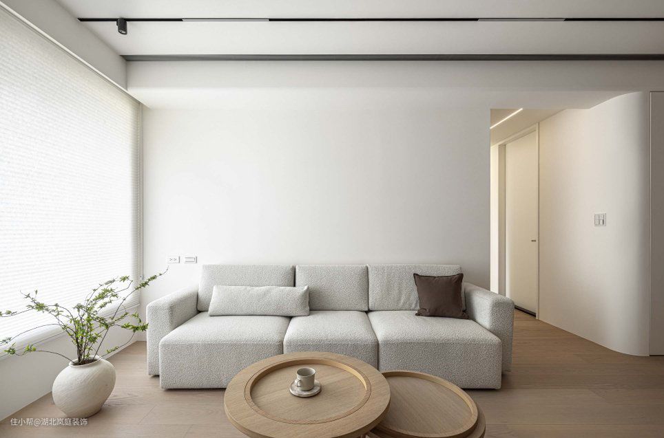 打开空间,客厅一览无余视野开阔,置身其中的通透感让人放松宁静。 简约精致的设计诉求浅灰基调涂料 交织层次弧形收边交界 大方圆润 隐藏门片规划 美感加乘水平灯带纵横 交错柔和 整体空间,以白色为底妆,辅以原木色,打造了温柔平和的空间氛围,阳台纳入了客厅,让阳光离我们更近一些。 客厅无主灯设计,享受空间的轻松感。筒灯、嵌入式灯带等光源营造出光的氛围感。 白色很容易产生单调感,缺少层次感,设计师巧用绿植、立体的电视背景墙,加入灯带的设计,用不同材质进行搭配,让整个空间有了深浅对比,进而产生层次上的变化。木质圆茶几灵动便捷,木质贴近自然。 客厅铺就木质地板,极简形态,融合实用价值稳定社交场景,强调无限交流的趣致,刻录环境内外的静逸感,萦绕出惬意舒怡的氛围。
