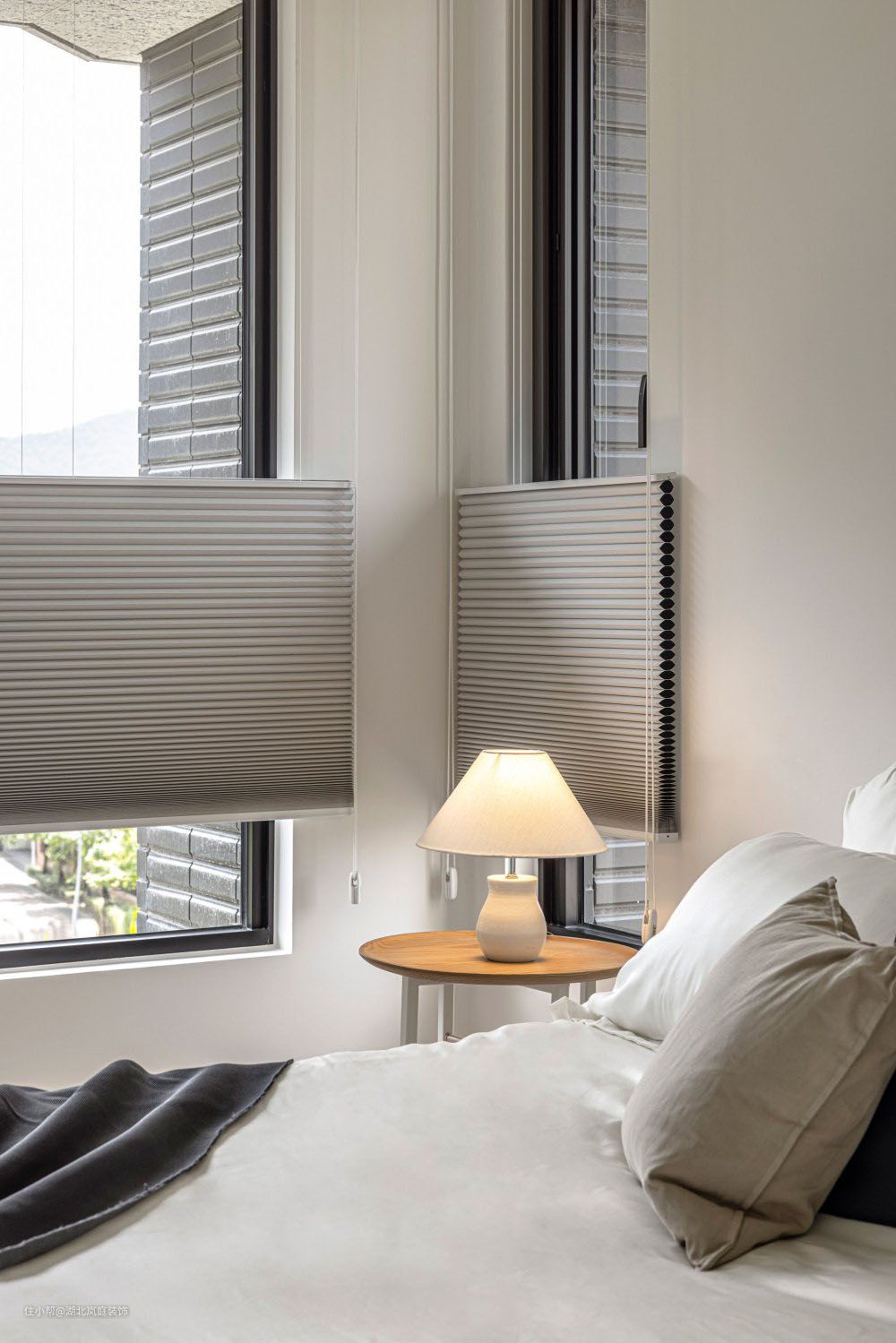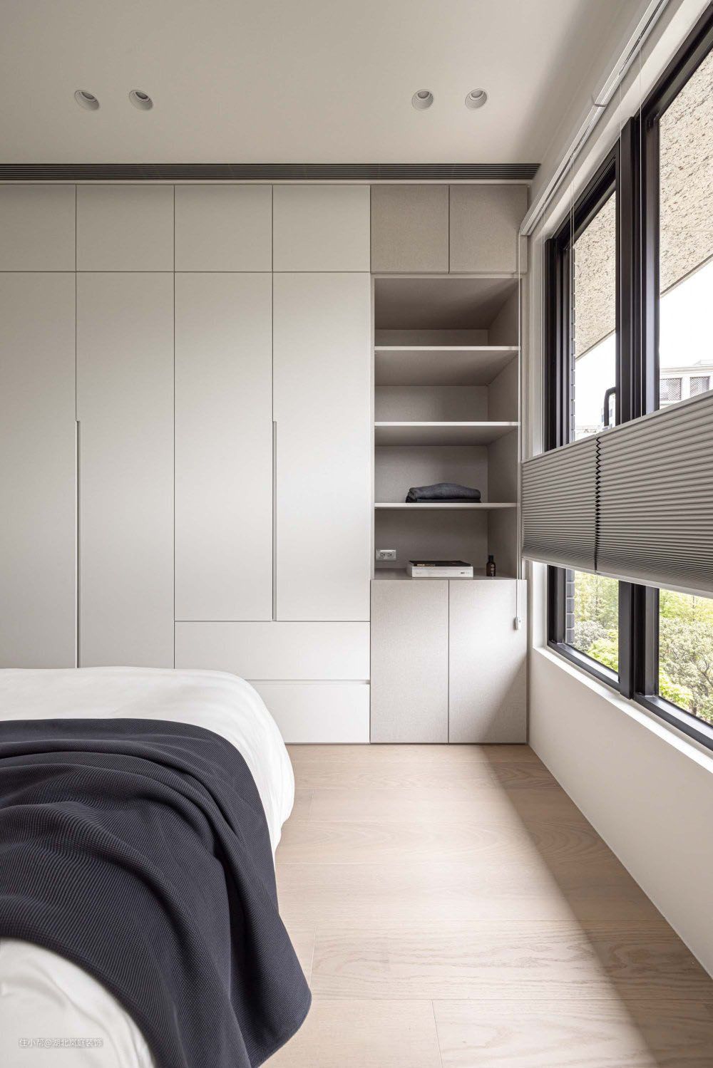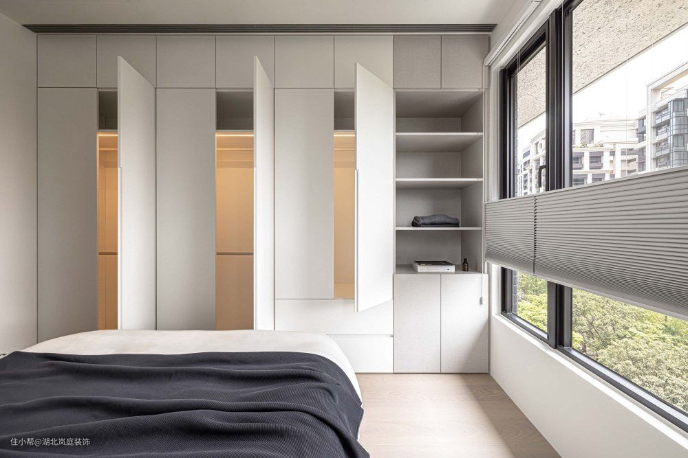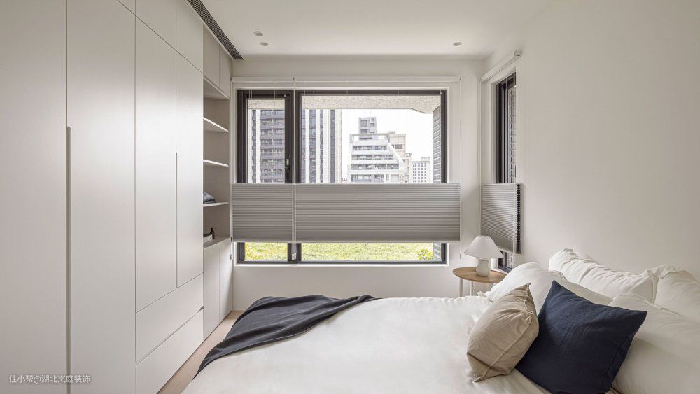 整个空间仍旧大面积留白,延续了大空间的色彩基调,空间弥漫着静谧安宁。墙壁,窗帘,床品,色系相互搭配,营造后的色调,充满温度,舒适放松。 空间运用了少量深色系软装单品百叶窗的设计,衣柜和床头灯的暖色系灯光,都可以让空间从简约原木的温馨感中提炼出现代感的精致线条。 一半生活一半诗意,就是家最美好的样子。利用浅灰色系材质与白色营造出来的层次感让空间简约又不显单调。