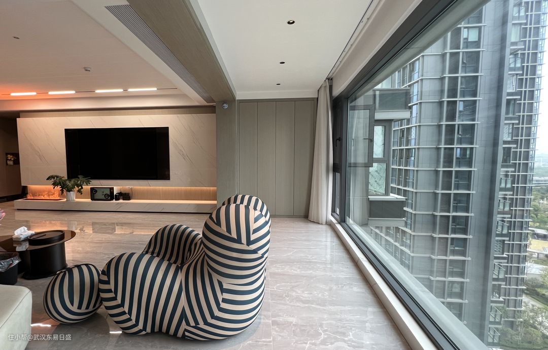 电视背景墙选择白色石材加上钢板的组合设计,下方留空处设置灯带,增加整个空间的层次感,看起来也不会过于单调。电视也是做的内嵌设计,使其与背景墙成为一个整体,更加和谐统一。 整面的落地窗保证了客厅空间的绝佳采光,原始的客厅空间没有这么敞亮,我们把客厅与次卧打通,放大整个活动空间面积,也显得更加透亮。