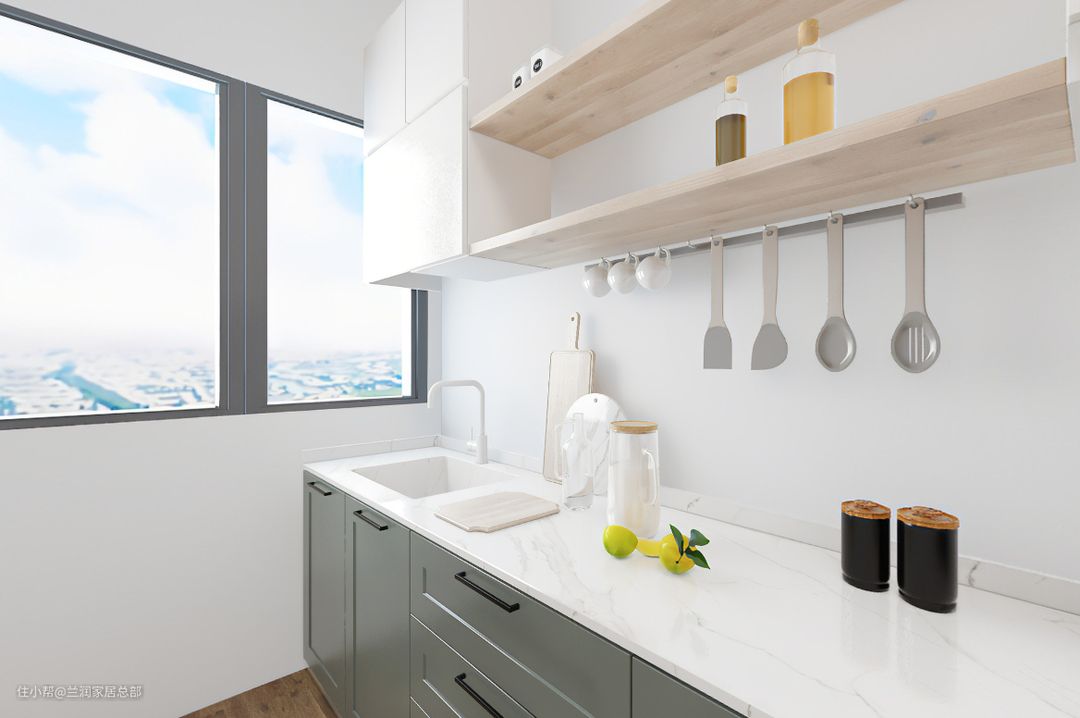 厨房一字型布局,动线简单明了,烹饪操作方便快捷。白色吊柜与墨绿色地柜形成色彩对比,干净整洁中带着清新自然的气息,冰箱嵌入柜体设计,整体性更强更统一。