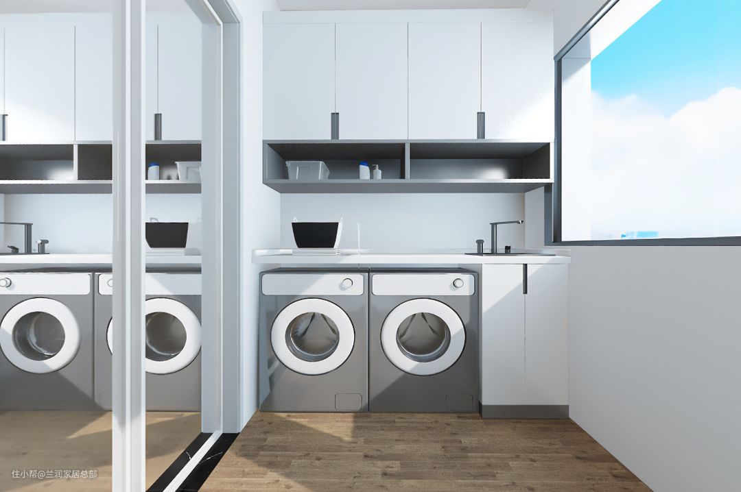 阳台一侧设计台面,台下洗衣机与烘干机左右放置嵌入柜体,旁边设计小型盥洗池,手洗衣物更方便快捷。上方吊柜设计,提供了更多的收纳空间。