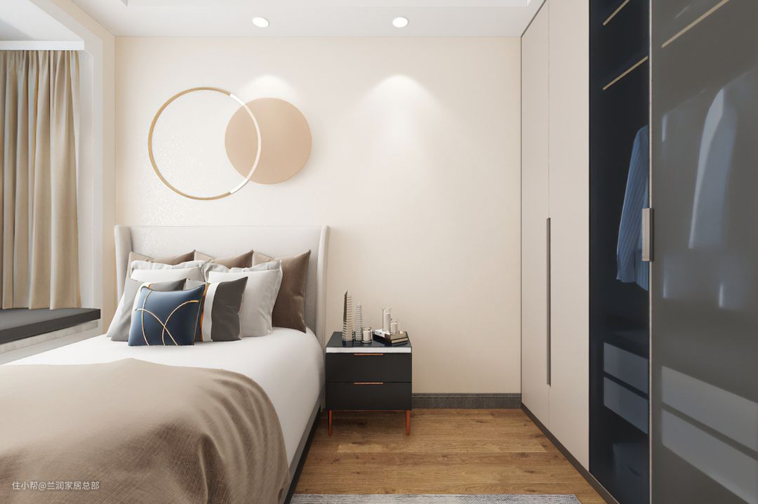卧室到顶式衣柜不留清洁死角,打扫起来更方便。墙面通刷米色乳胶漆,搭配简约的装饰,简洁干净又温馨舒适。