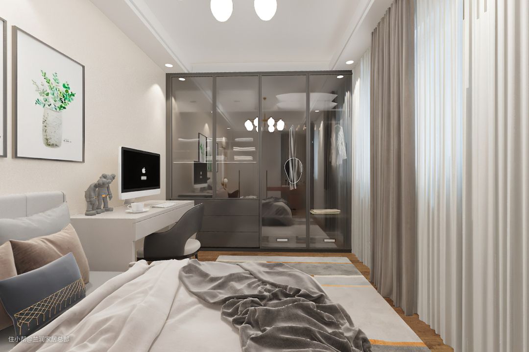 次卧左右两侧靠墙处均设计衣柜,一侧为到顶式封闭衣柜,增大收纳空间的同时,也能更好的保护隐私。另一侧设计到顶式玻璃衣柜,内部衣物收纳一目了然,放置常用衣物,拿取更加方便快捷。