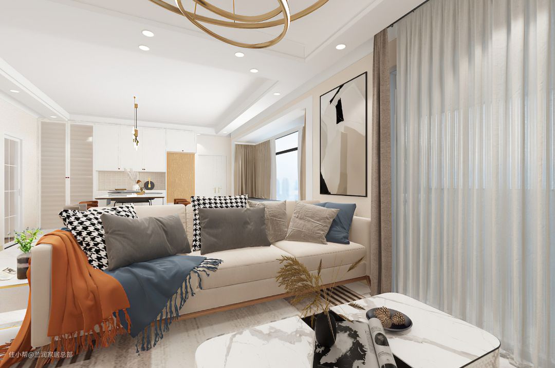 客厅墙面通刷米色乳胶漆,电视背景墙不做繁杂装饰,仅用悬空常规做为电视柜,让客厅看起来简洁明了,轻重有度。 慵懒的沙发搭配大理石茶几,顶部线性灯的装饰,让空间更具有质感和层次感。