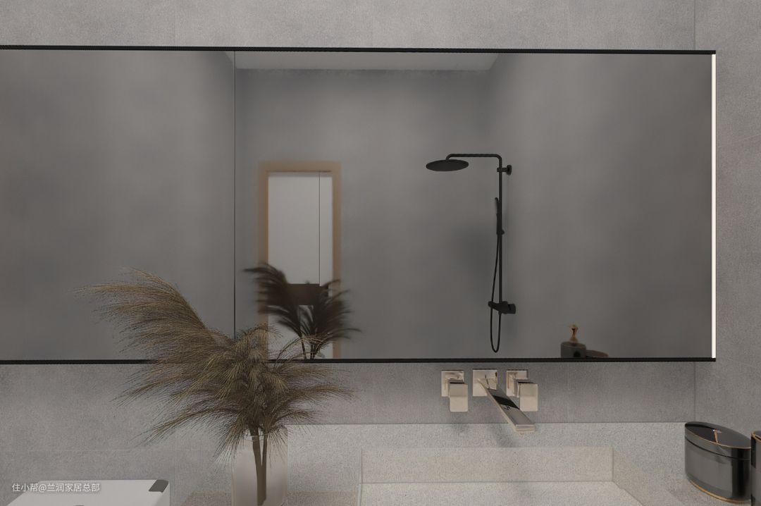 卫生间干湿分离设计,让干区保持更干净整洁。岩板洗漱台上方设计双盘台上盘,既美观大气,又避免了洗漱拥挤。台下吊柜设计双层抽屉形式,左右两侧留空设计,让收纳更加方便实用。