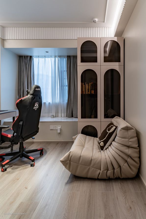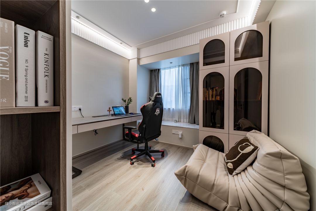 书房是年轻小夫妻打游戏、看书的多功能活动空间。整体设计以奶油裸色为空间主导,营造宁静安逸之感;再借助简约的法式线条以及柔和的波浪造型,铺就空间的浪漫法式氛围。 定制通顶收纳柜,封闭与开放柜体结合,展示性与功能性兼并;靠墙摆放超长书桌,可供男女主人同时办公、打游戏。 角落布置轻奢实木书柜,补充收纳;拱门造型契合法式主题,完美融入整体空间。毛毛虫沙发的置入,将慵懒的氛围轻松拿捏,让居家生活更舒适惬意。