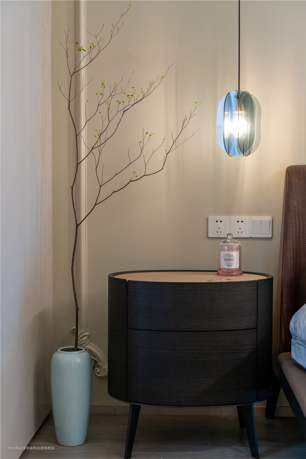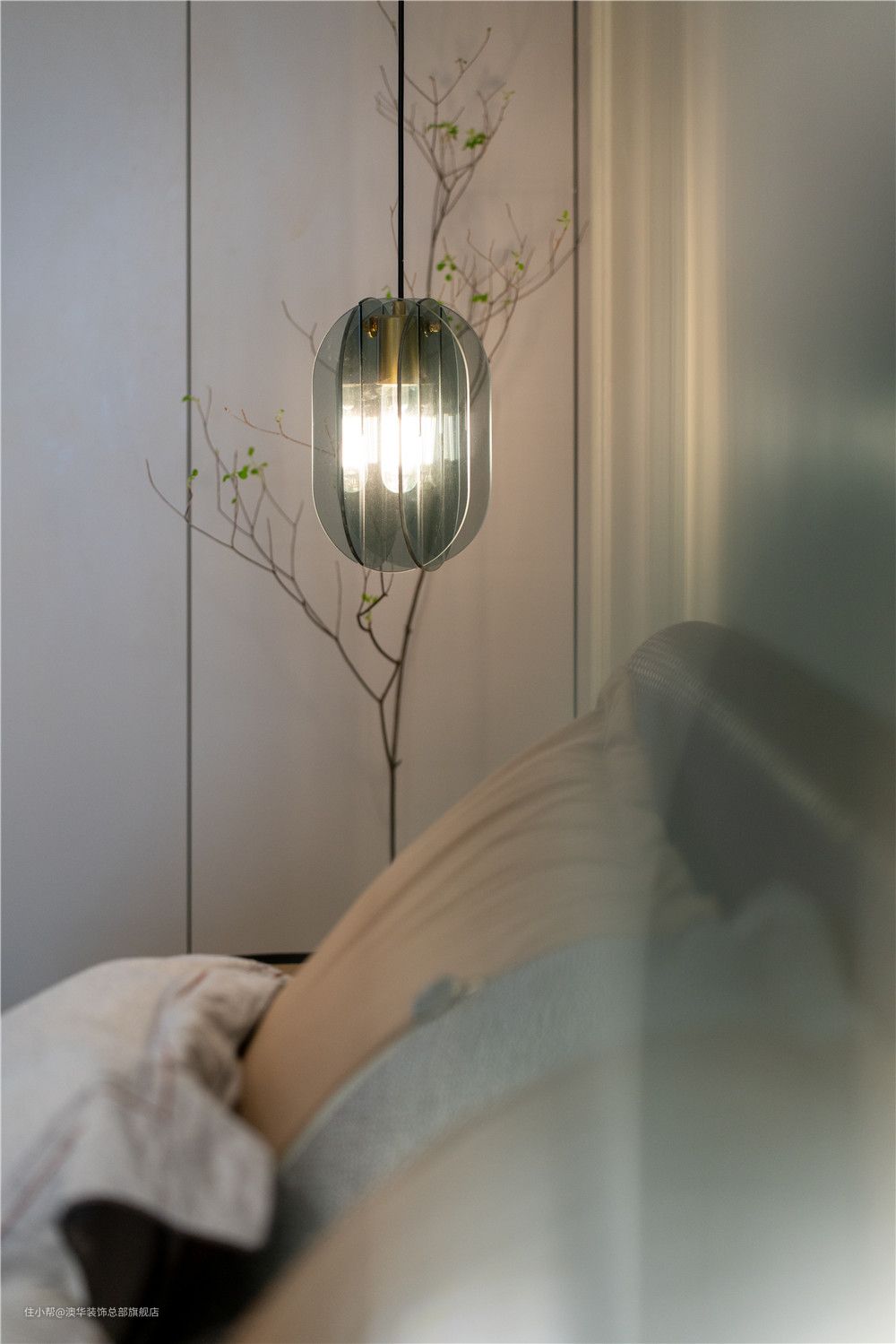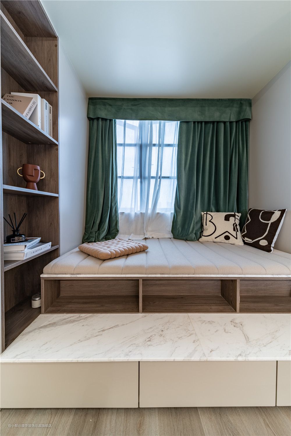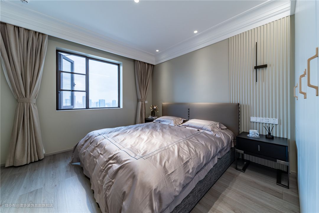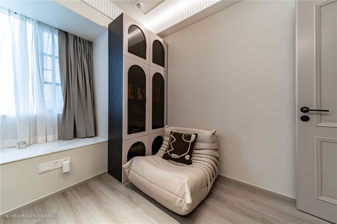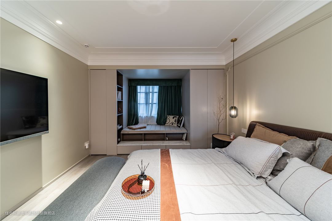 见惯了繁华的堆砌,现代法式的优雅与浪漫,某种意义上更符合当代人的精神追求。硬朗分明的线条在白色顶面和奶茶色墙面穿插而行,柔软的床品形成美学上的冲突,碰撞出多元的设计魅力。 灯光设计的运用,为卧室平添更多精致的现代想象,筒灯、射灯、吊灯交相辉映、和谐共奏。夜幕初临,等待一束柔光亮起,点亮满屋的浪漫。 床头角落,极简实木床头柜搭配生机盎然的绿植,都市的轻奢感静静伫立;当柔和光线倾斜而进,会呼吸的“美学内涵”由此掀起! 因原有结构的局限,飘窗无法拆除,设计师反其道而行,通过加宽窗台,在两侧增设储物柜,将其打造成了一个兼具收纳与休闲的多功能区。 石材台面铺上软垫后,这里就是个惬意的阅读角。小夫妻可以在这里聊天、看书,在舒适中放松自我,感受卧室带来的慵懒与惬意。