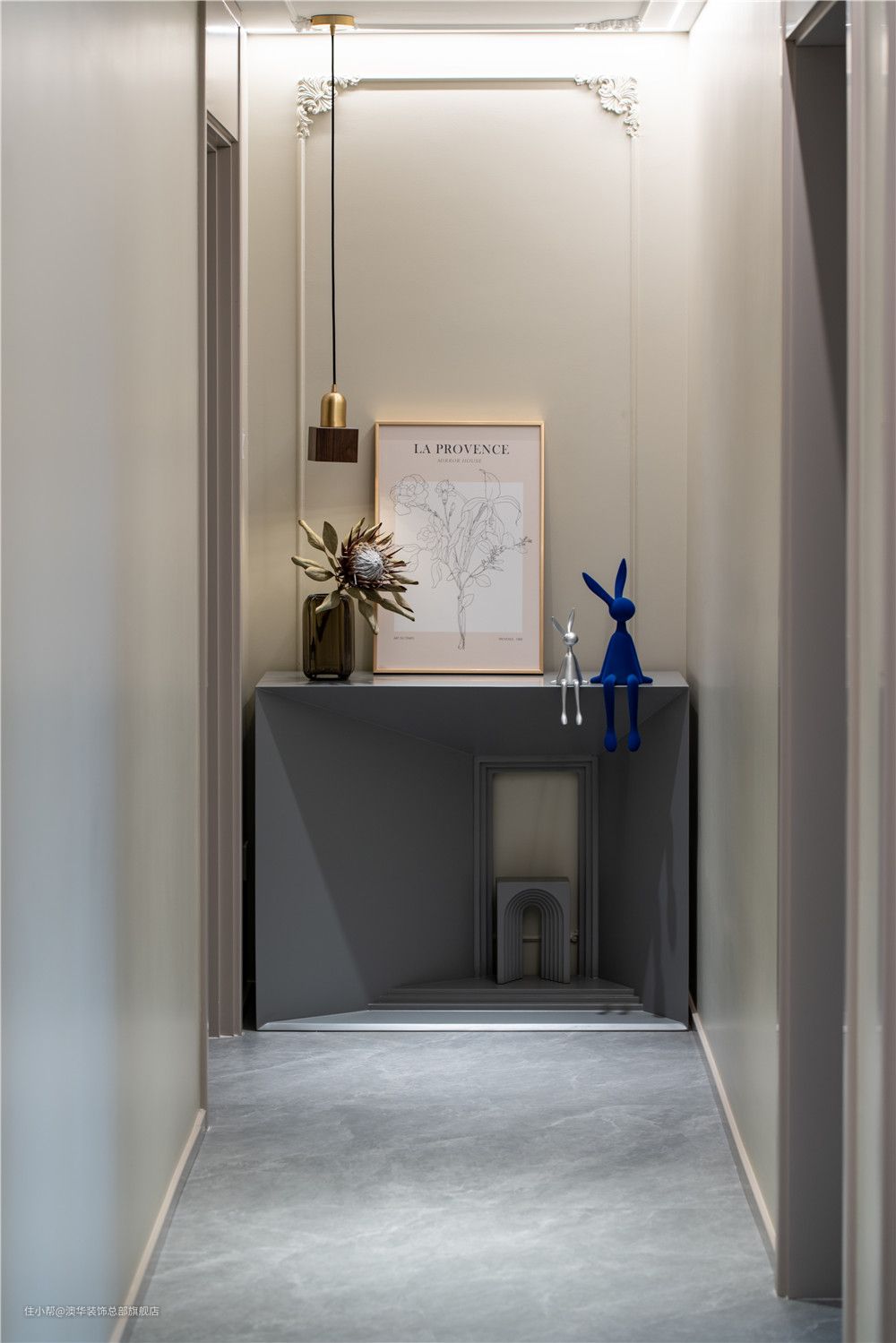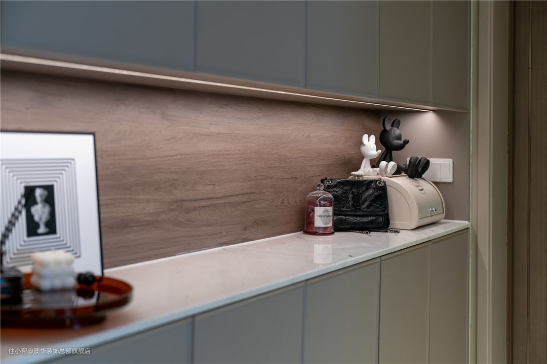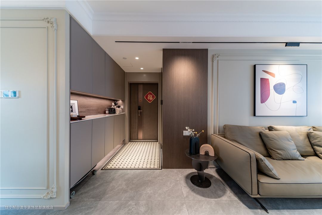 中部镂空处用几个单品去点缀,竟生出一种艺术趣味,让人不经意间思绪停留,只被眼前的光景吸引。 玄关的尽头宛若一个艺术长廊,复古雕花、文艺摆件与趣味的微缩造型一起,使古韵与现代时尚相互辉映,在光影的渲染下,呈现一种流动韵律的美感。