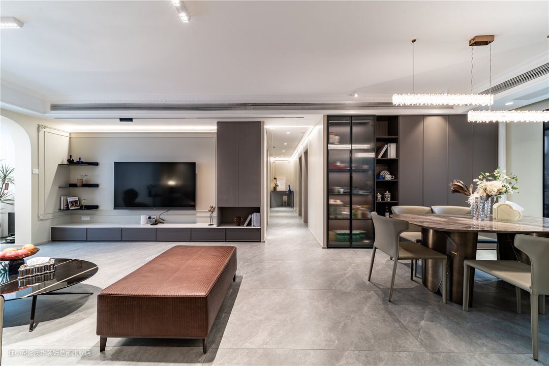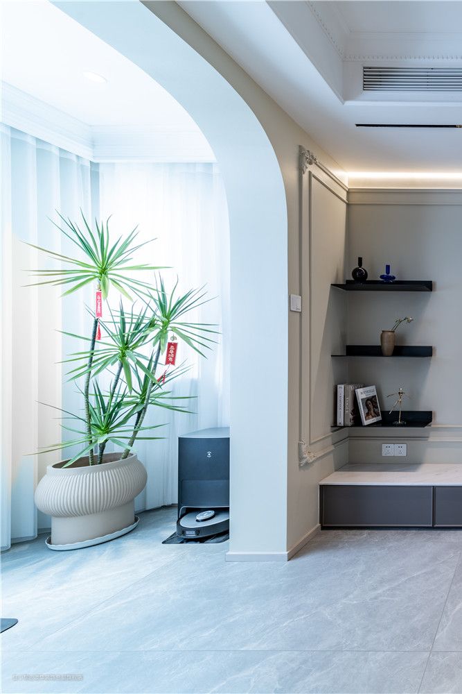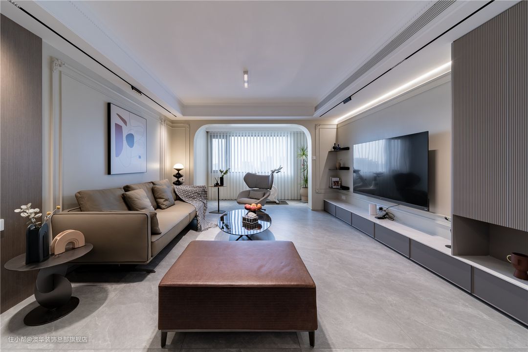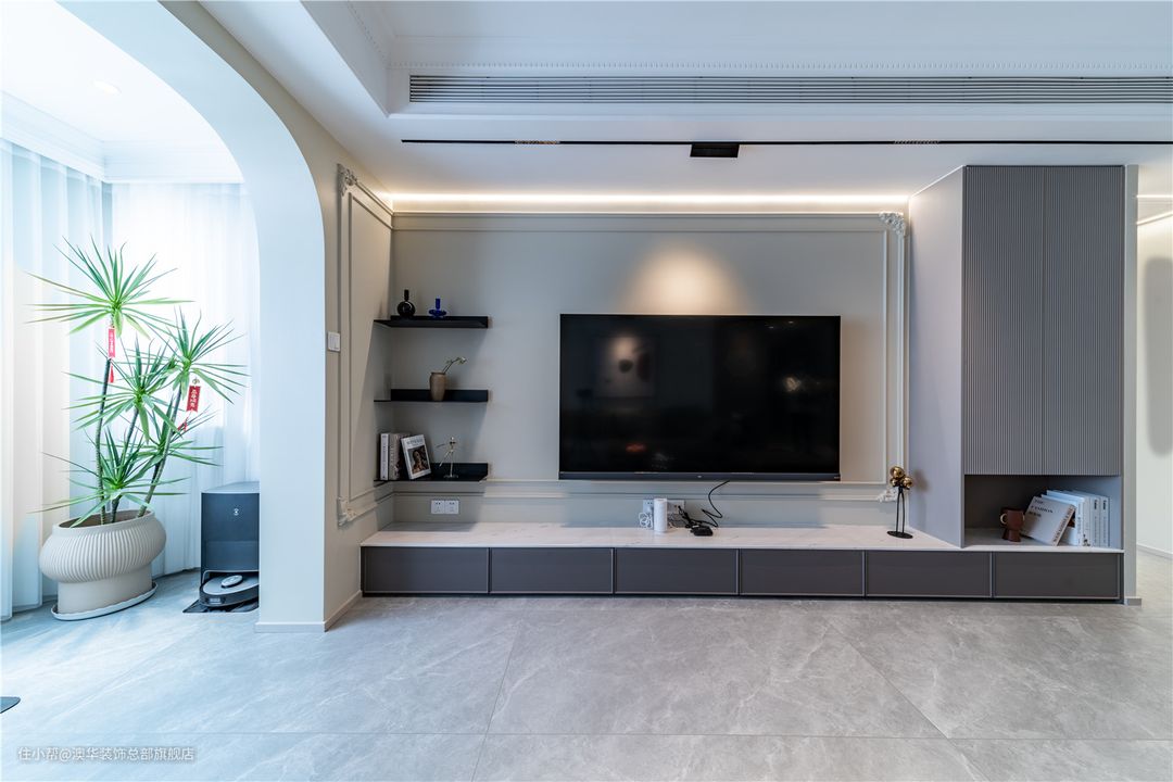 以具有现代风和品质感的生活方式为出发点,客厅采用柔和的色彩铺叙,墙面以奶油色为基底,地面择取灰色地砖,搭配低饱和度的软装配饰,营造出优雅、细腻、舒适的家庭氛围。 硬装设计上,设计师捕捉法式风格的精髓,运用硬朗复古的雕花线条、弧线柔美的拱形门洞,将精致、浪漫的空间格调娓娓道来。 L型电视柜、立体线条、隐形灯带组合,共同构建多层次的电视背景,整体简约不失精致感。陈列其中的书籍、艺术展品,赋予空间更多的文化底蕴,增添满满的高级感。