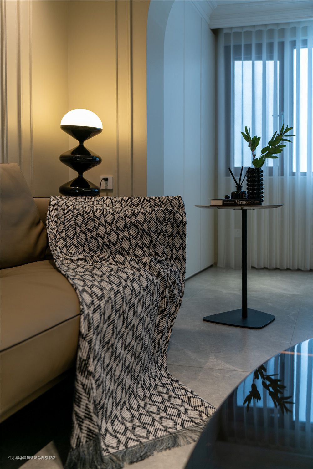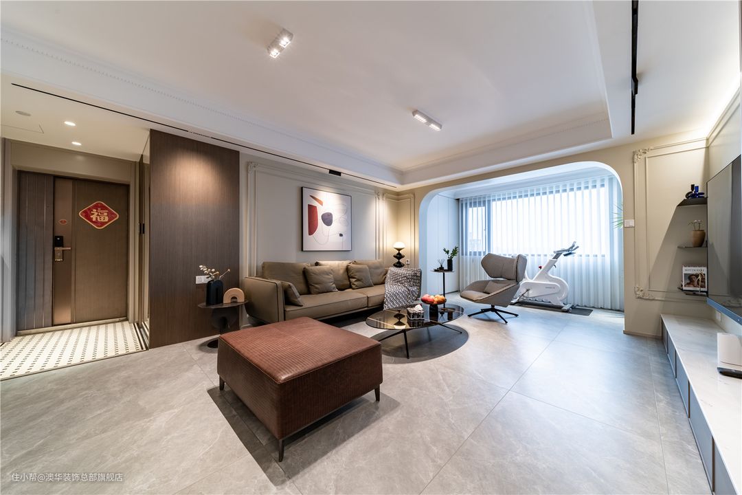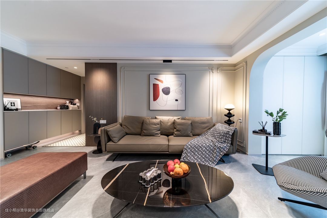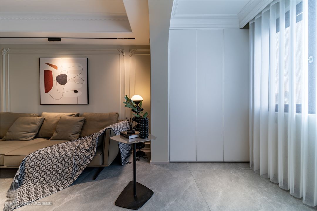 以具有现代风和品质感的生活方式为出发点,客厅采用柔和的色彩铺叙,墙面以奶油色为基底,地面择取灰色地砖,搭配低饱和度的软装配饰,营造出优雅、细腻、舒适的家庭氛围。 硬装设计上,设计师捕捉法式风格的精髓,运用硬朗复古的雕花线条、弧线柔美的拱形门洞,将精致、浪漫的空间格调娓娓道来。 L型电视柜、立体线条、隐形灯带组合,共同构建多层次的电视背景,整体简约不失精致感。陈列其中的书籍、艺术展品,赋予空间更多的文化底蕴,增添满满的高级感。