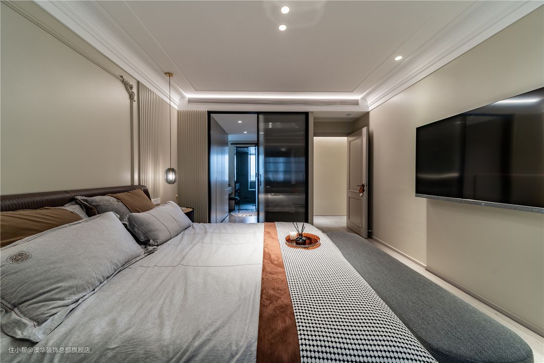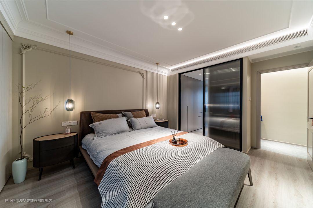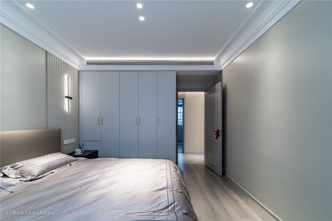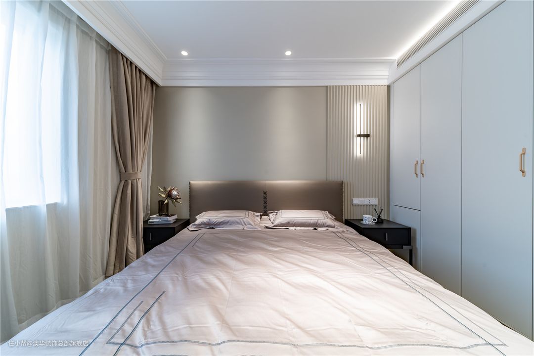 次卧作为父母房的预留,整体采用低对比度的奶油色系,满足了休憩时所需要的沉静之感,营造出柔和温馨的空间氛围。 顶部寥寥几笔线条勾勒,加深空间层次;墙面辅以格栅元素点缀,高级的形态应运而生。黑色系壁灯跳跃出整体画面,临摹出艺术美学的空间张力。没有张扬的风格演绎,删繁就简,呈现安然的理想状态。 对品质居所的诠释,融入到每一方寸间。奶油色皮床、对称床头柜、高雅的床品相互依存,打磨出闪耀的空间品质。定制通顶收纳柜,搭配金色把手,将精致外化,从细枝末节处诠释“品质哲学”。