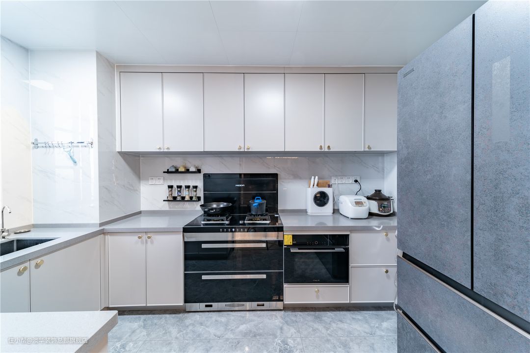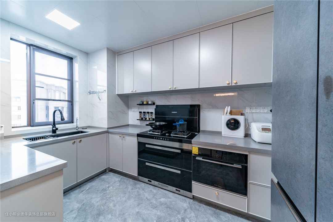 厨房开窗不大,在白色与浅灰的大框架下,室内采光得到了有效提升。清浅柔和的配色,更是全方位地表达着纯净的面貌,助力每一次健康烹饪。 U型台面,分区明确,大致可分为备菜区、洗菜区、炒菜区、装盘区、电器区。整体布局紧凑不杂乱,动线流畅。 橱柜依据烹饪者身高定制,符合人体工程学,使用起来更省力、更舒适。精致的基调,可以从生活物品中窥见一二。带沥水架的大单槽、可抽拉水龙头、带保护开关的插座、嵌入式厨电,让你尽享舒适烹饪环境。