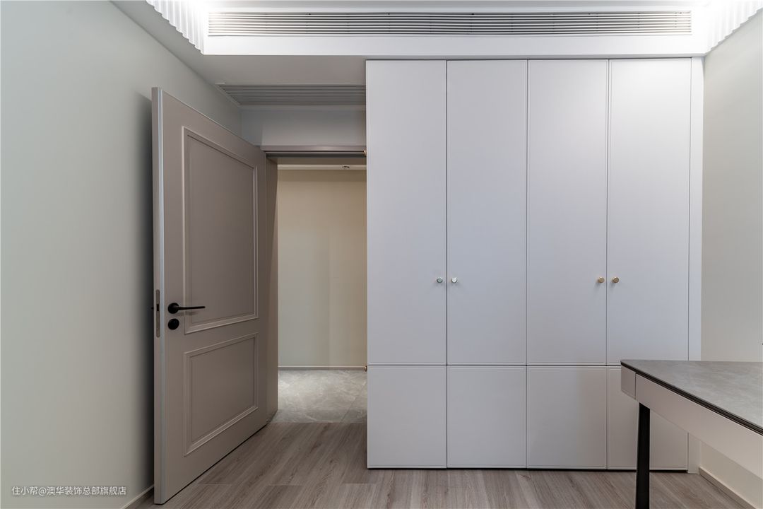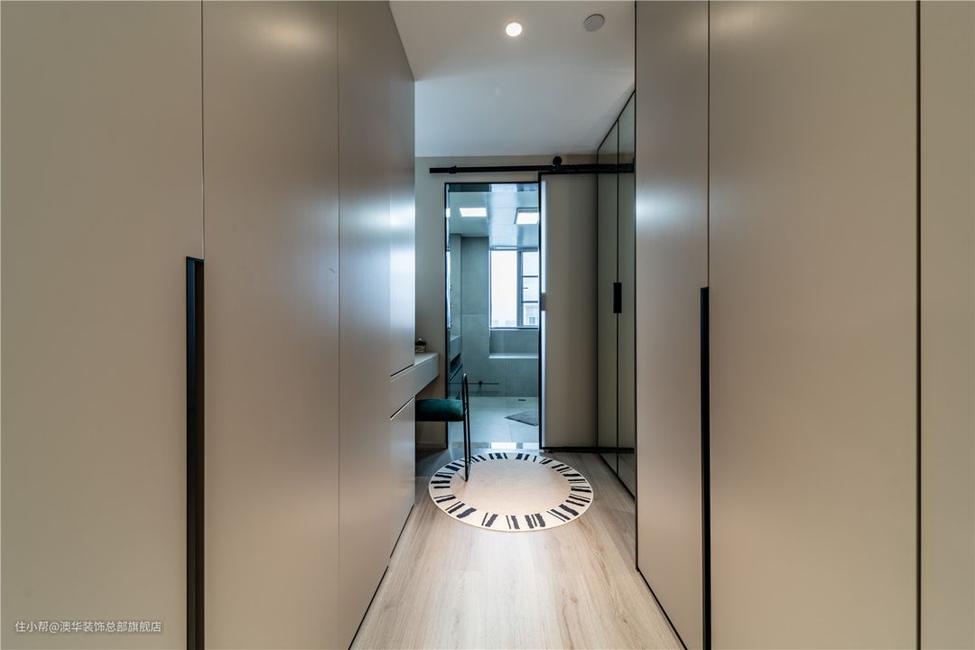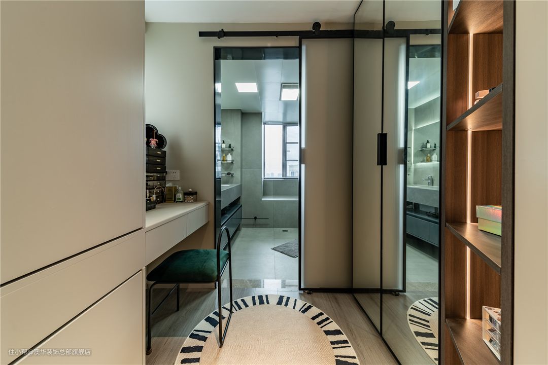 主卧的内侧是独立衣帽间,二者之间以长虹玻璃门进行隔断,透光不透视的特点,让居于中部的衣帽间也可以保持通透明亮。 藉由镜面的反射与灯带的光源,带动空间的流通感,打造出多维的视觉效果,不动声色地透露着低调的优雅。 规划有序的柜体,集收纳、展示、梳妆为一体。一门到顶的衣柜,拉伸了空间的纵深感;转角处的展示格,加持空间的轻奢高级感;临窗打造悬浮梳妆台,光线充足,无需另外补光,即可清晰照出你的美。
