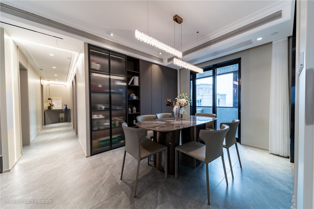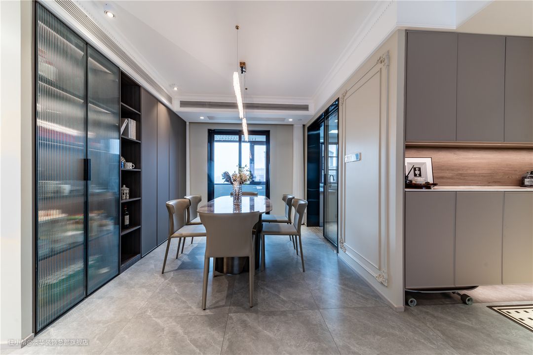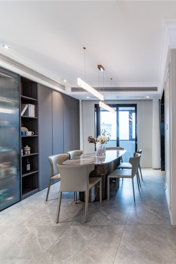 用餐区与客厅没有硬性隔断,开放式布局让餐厅区域更显通透。整体色系搭配与客厅保持一致,以现代手法为框架,融入复古雕花线条装饰,塑造精致优雅的用餐环境。 大理石餐桌与奶油色餐椅,围合出一日三餐的仪式感。一字型水晶吊灯,映射长方形餐桌;纯天然水晶与墙面线条达成共鸣,增加了奢华的氛围。 餐厅空间,比较醒目的就是极致的收纳空间,大面积的柜子,方便日后的收纳,更容易保持整体空间的整洁性。 柜体采用开放格+封闭式设计,实木与玻璃组合,玻璃门透出的淡淡灯光,打破了柜体的沉闷,让空间显得更加灵动且富有层次。