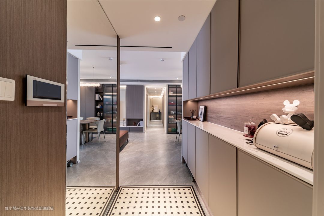 入户玄关处,悬空的鞋柜造型配合石材台面、线性灯带及装饰品,打造出一个艺术小空间。 通顶玄关柜紧密墙体结构,结合外墙硬包设计,实现了将柜体“隐藏”的效果,从外部来看更显简洁纯粹。 柜体对面采用实木拼接镜面设计,开关、可视电话都在这里,镜面设计无形中扩大了空间感受,也方便业主出入随时整理仪容。
