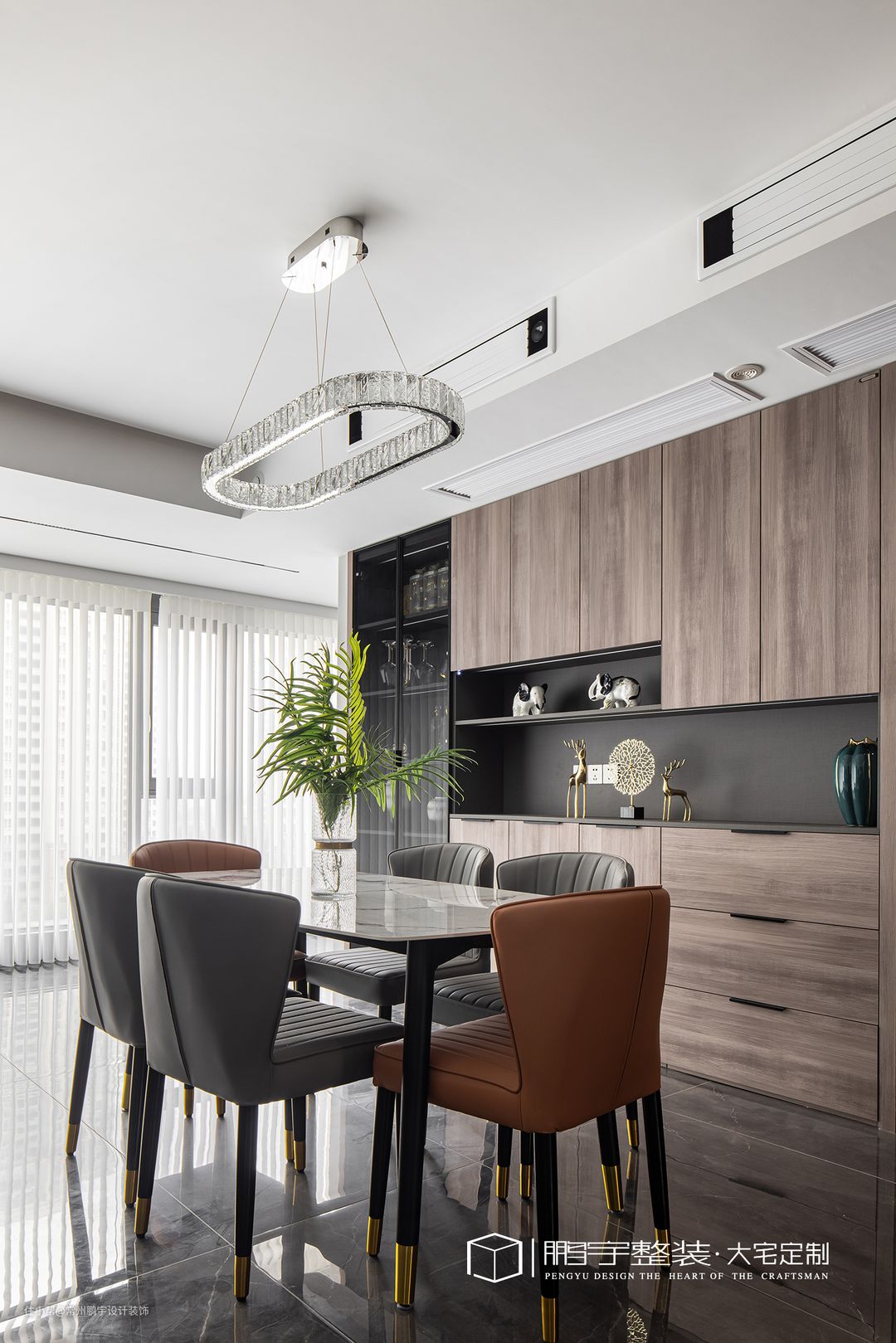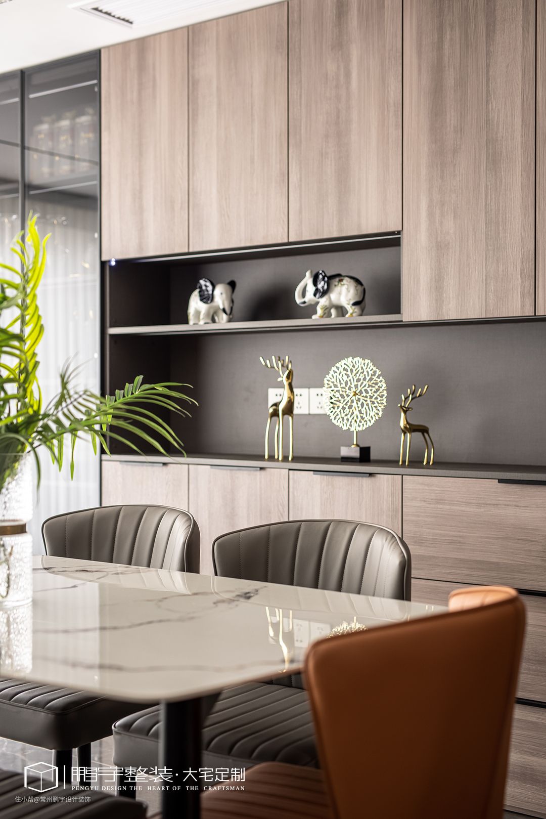 皮质餐椅带来高级感,不同颜色的搭配,避免了空间单调。沿墙一组嵌入式收纳柜,开放与封闭结合功能区分明确,可以更好的分区置物。