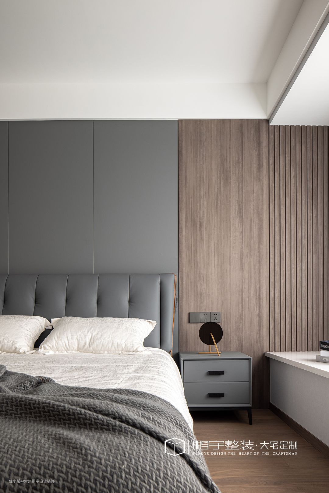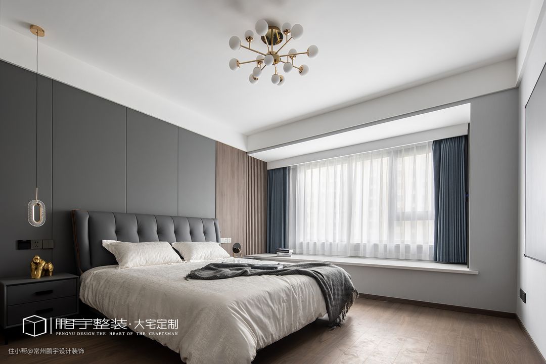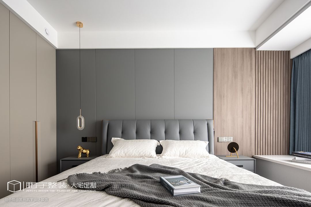 主卧选用棉质的纯色床品,温软舒适加上满满的包裹感给人一种踏实的安稳。床头背景墙的拼接造型设计,简单的线条凸显了空间的立体感。