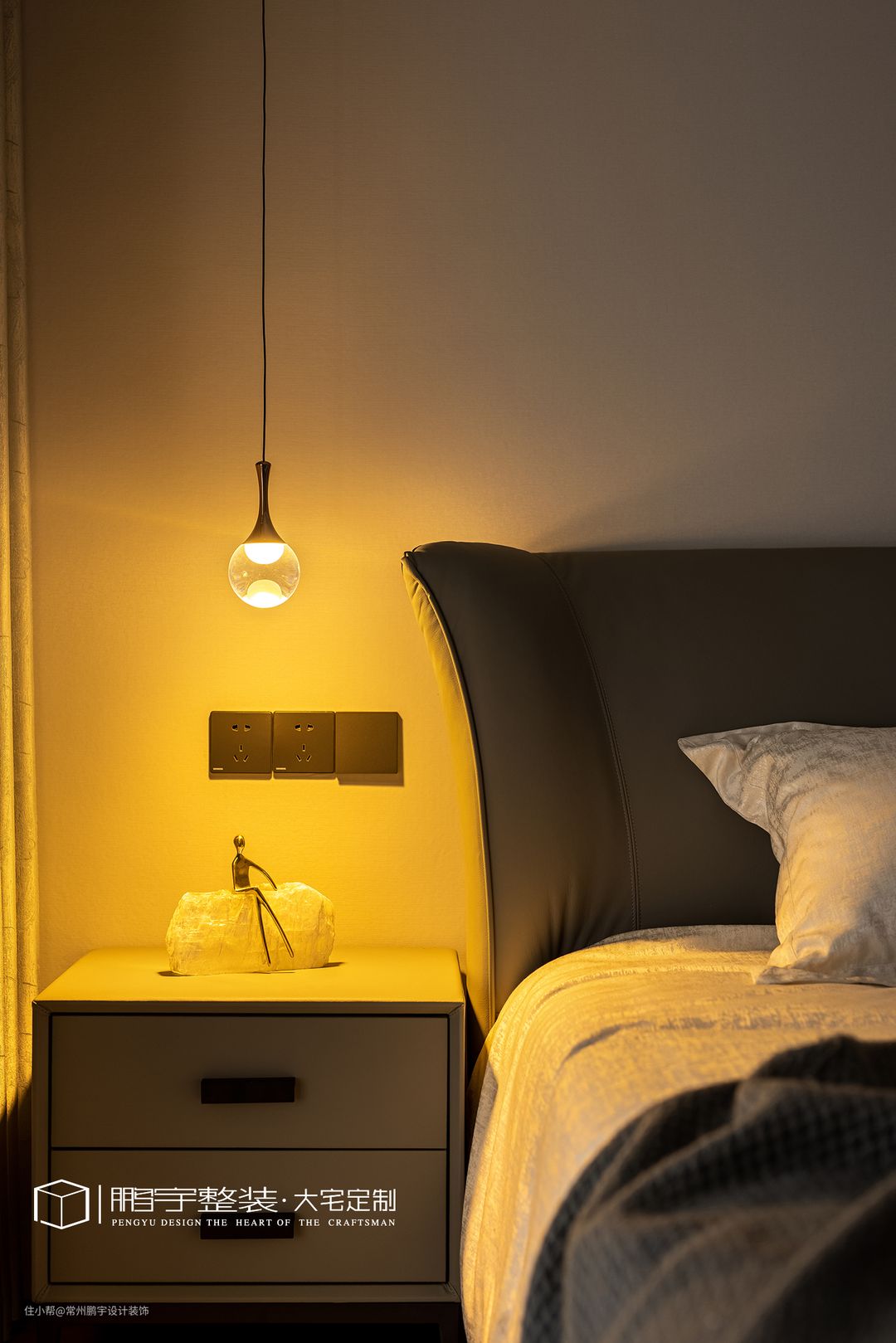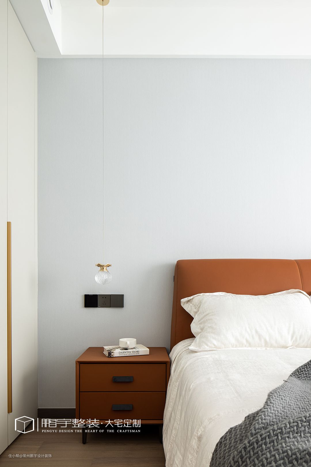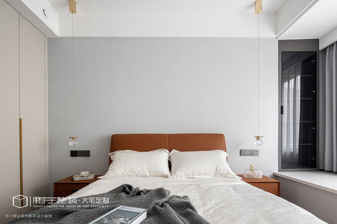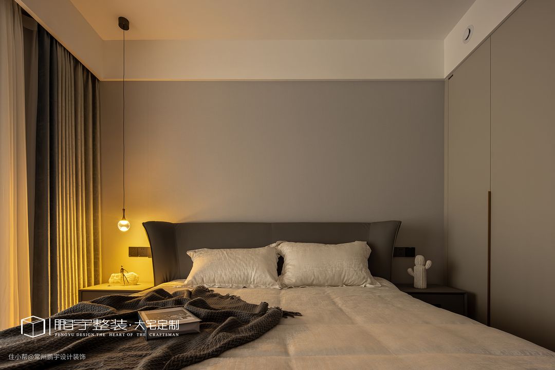 在延续空间整体氛围的同时,干净优雅的米灰色墙面给人自然清新的体验感,通顶定制衣柜完全满足屋主的生活需求。 次卧简单的装饰,迎合空间整体的配色风格让空间结构更加和谐。床头两侧打破对称布局,一侧安装琉璃吊灯,光线洒落,卧室有了温暖一角。