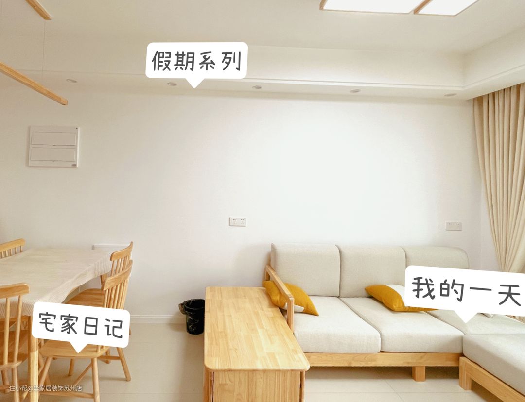 装修出来的效果呈原木奶油风,房间通刷白色乳胶漆,不仅明亮通透,还极大节省成本。客厅与阳台之间做隔断,采用隔音玻璃移门,减少外界噪音。