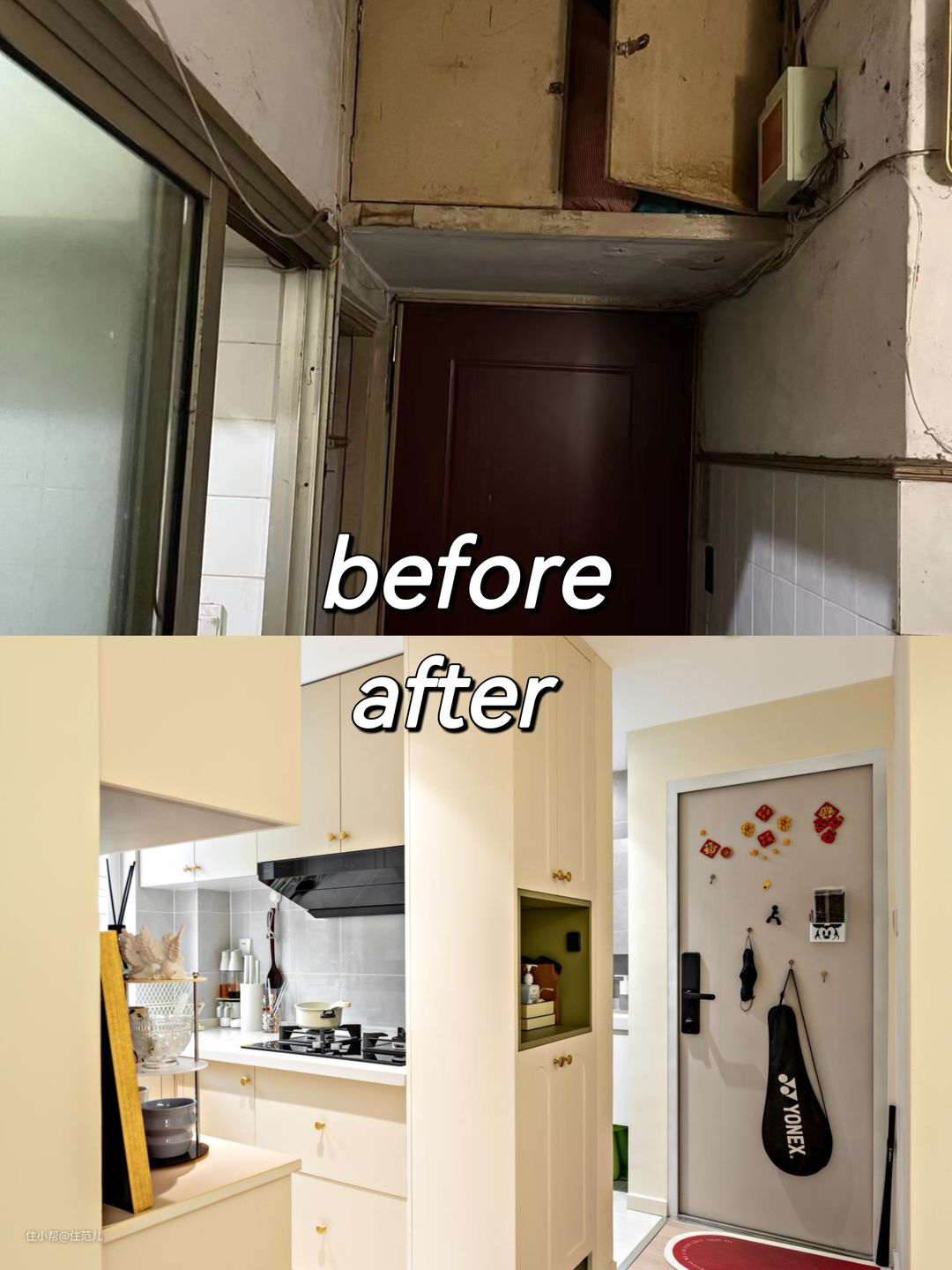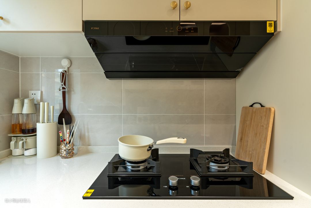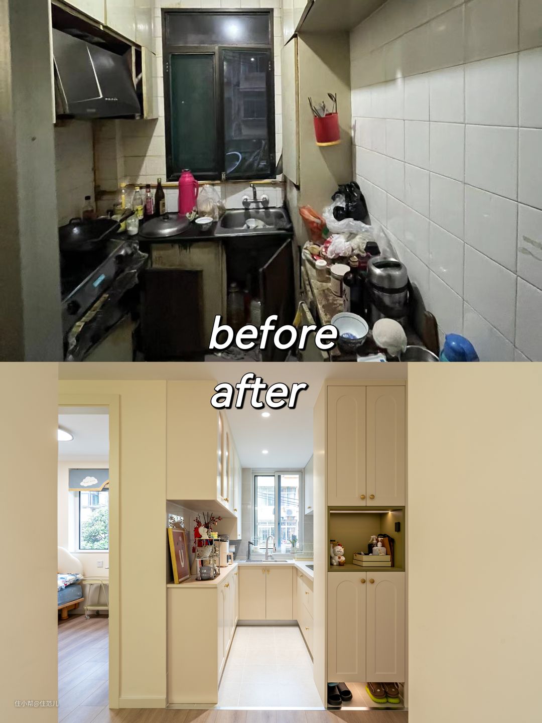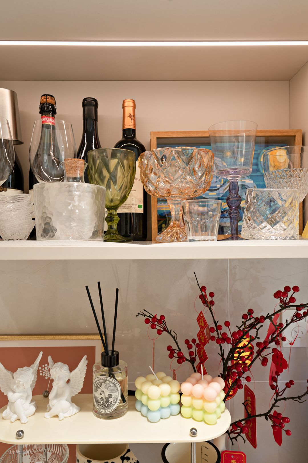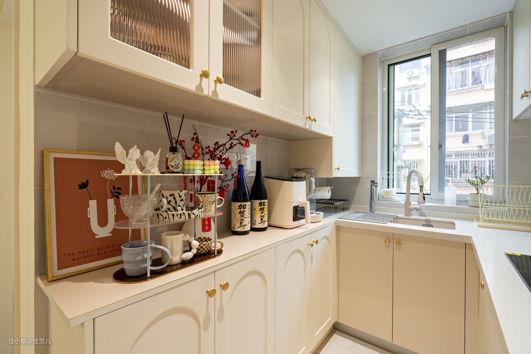 与卫生间一墙之隔的,是厨房,位置同样没变。 变得是通过增加“定制柜”面积,增加收纳面积,让小厨房看起来尽量整洁。 改造后的厨房是标准的“U”型厨房,从吊柜、地柜都增加了大量收纳空间。尤其是油烟机下方双层抽屉的加入,让碗、盘子能更方便拿取。 此外,更大变化是,原来的洗菜区、炒菜区、切菜区操作面积都在变大,用起来更顺手。 但讲真,Jessica家这个厨房的使用频率并没有想象那么高。 了解中按照她的说法,她用的最多的是煮,煮粥、煮菜、煮熟食。因为是个资深健身迷,她会很严格的控制摄入热量,在保持营养均衡的基础上,尽量少油少盐。 她还喜欢没事喝点小酒,尤其是米酒,专酒用专杯,因此专买了个置物架,专门放她的杯子。 这架子我在北京seven家里,也见过,放在法式、奶油风里,确实还不错。