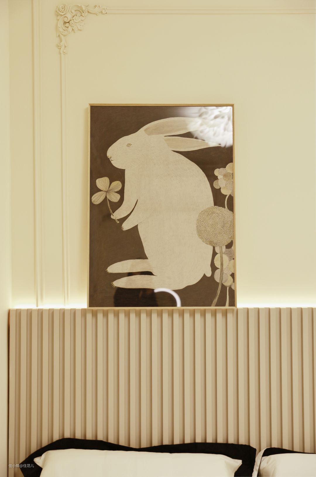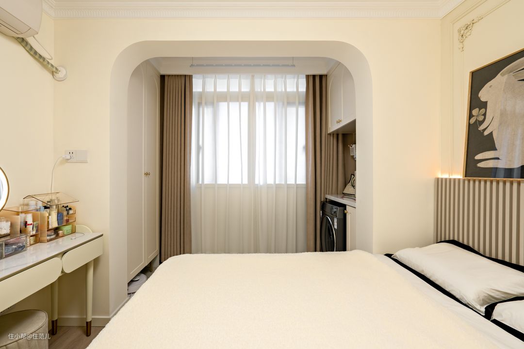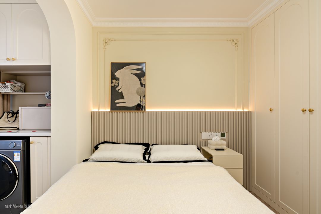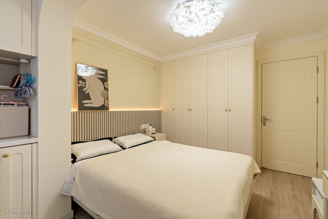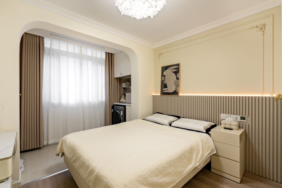 从“第二幕布”这面墙进去,就是主卧。 主卧延续了客厅的“法式奶油风”,与阳台链接的弧形元素、PU线条都在这里得到复用。 唯独不同的是,主卧的背景墙特地刷了PPG的颜色加深款1102-2,同时借助栅格板和线性灯打造氛围,从视觉和使用上增加空间层次。 Jessica进入主卧时,会习惯的先开线性灯,选择暖色发光,她说这才是卧室该有的氛围,能让她快速入睡。