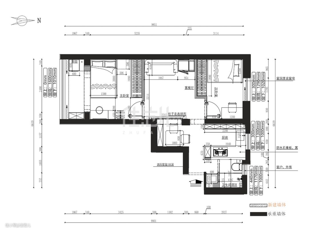改造重点的部分,也是在不动承重墙体的情况下,新建部分墙体,让空间能更合理的布局。 比如 1.卫生间台盆处新建墙体,方便做“干湿三分离” 2.次卧新建L型墙体,方便与定制柜结合; 3.主卧外沿新建墙体,扩大主卧面积同时方便置入定制柜; 4.不动客厅中心的承重柱,成为“第二面投影屏”的依靠 5.再其次,就尽量规划好每面墙,做收纳,全屋定制面积30㎡。