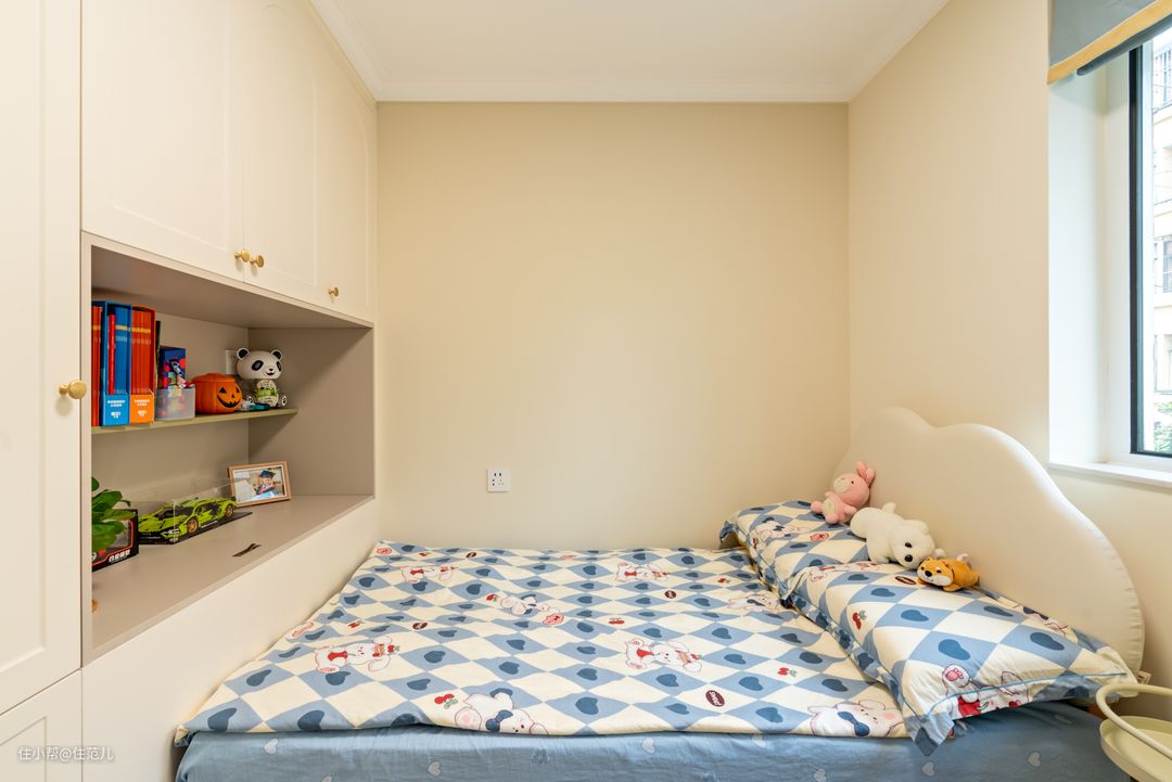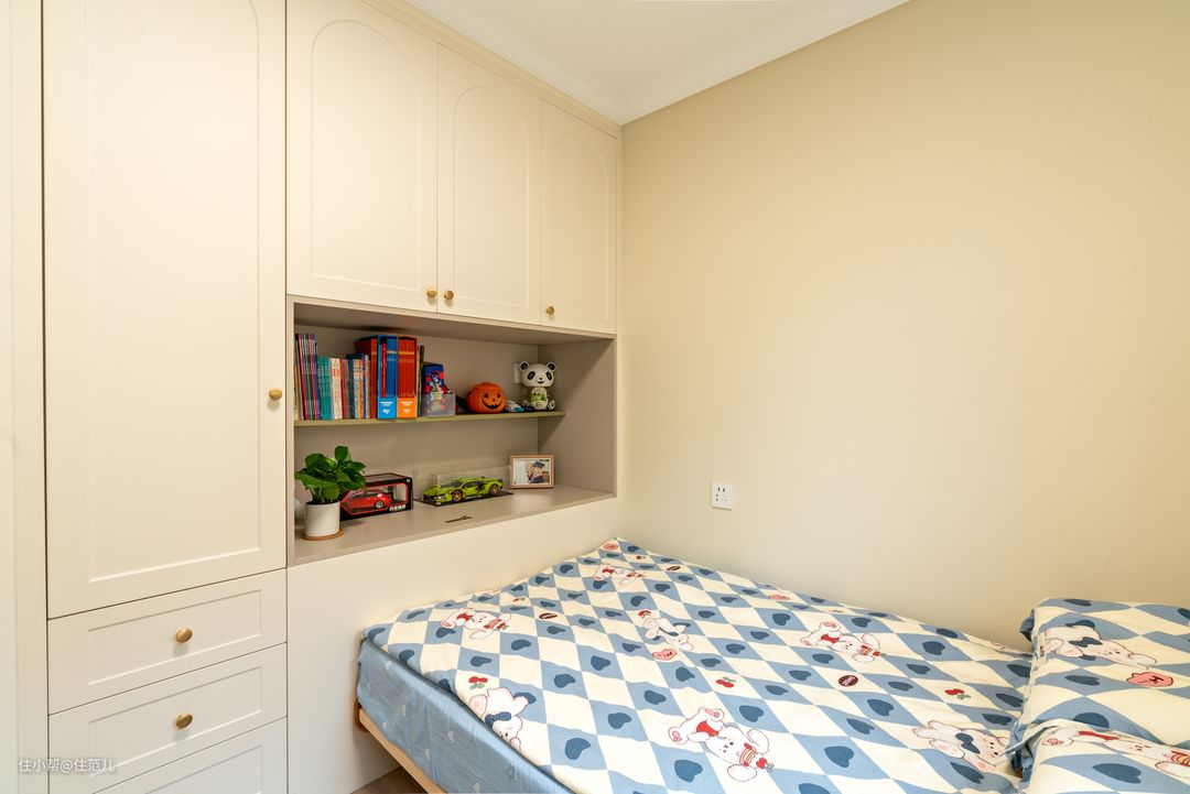 从客厅看向儿童房) 主卧对门,是次卧。 设计师特地做了“L”型墙体,为小次卧增加了定制柜面积。 次卧是jessica儿子在住,是个6岁的小男孩。 床也选择了1.2x2m的床;旁边就是网购的学习桌,可在1~1.5m范围内调节高度。 Jessica对待养娃的态度是,乐观引导、积极沟通,但过度不鸡娃。她觉得鸡娃与其占据自己的时间,让她和宝宝都不快乐,不如让它随着兴趣发展,以引导为主。 “当然,这也是相对的。”她说。 ⭐结语: 坦白说,jessica可能是目前为止,我自己见过最保持自我的妈妈了,我个人很欣赏她。 其实,每次出差去上海,我必定找一个真实人家去采,目的就是希望能更从聊天中更了解大家的需求和不同的生活状态。 住范儿一直鼓励大家不拘泥于传统,按照自己想要的家做设计,本质还是希望大家能梳理自己的生活状态,过得更自我,更考虑自己家。 就像每个个体,都该得到尊重与理解一个道理。 这就是今天的真实人家,希望大家喜欢,“点赞+收藏”~