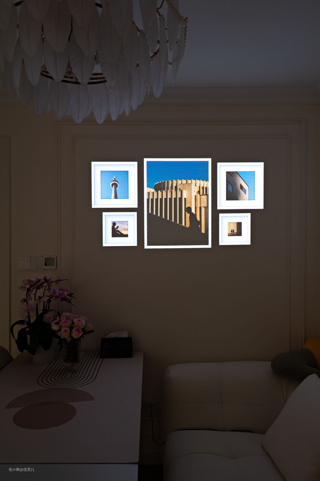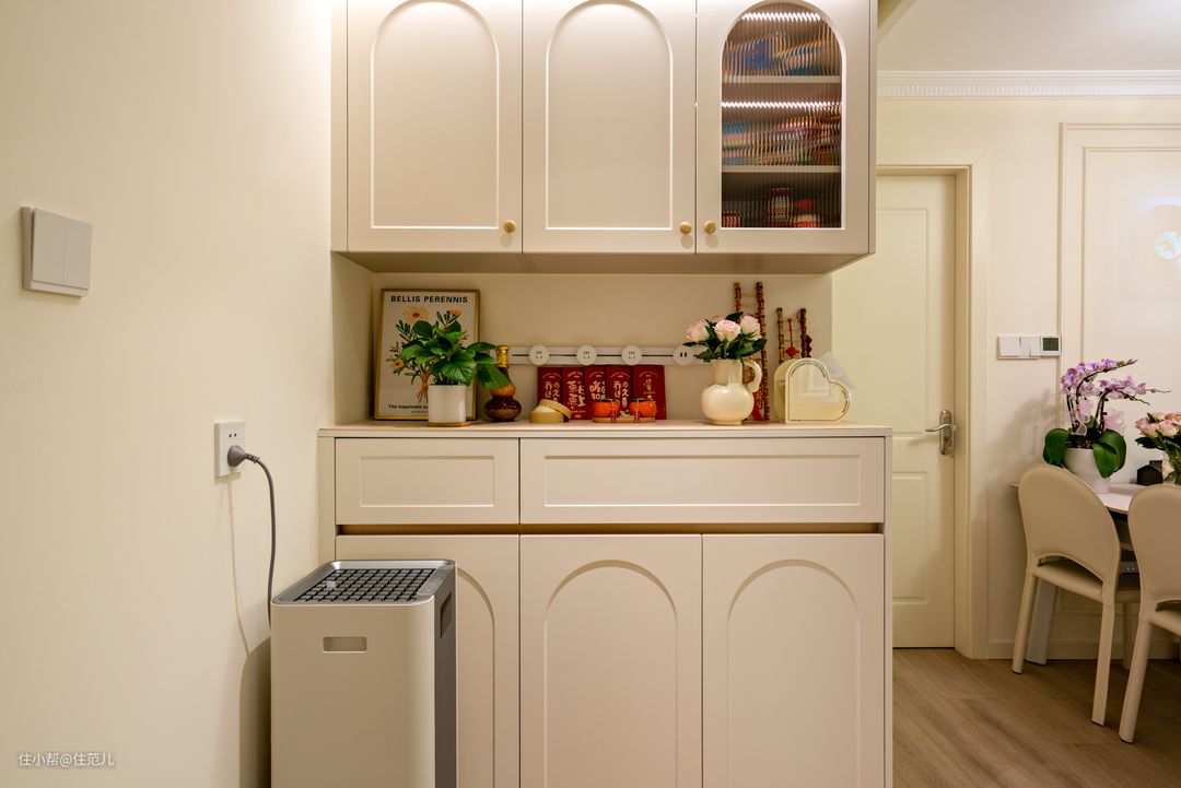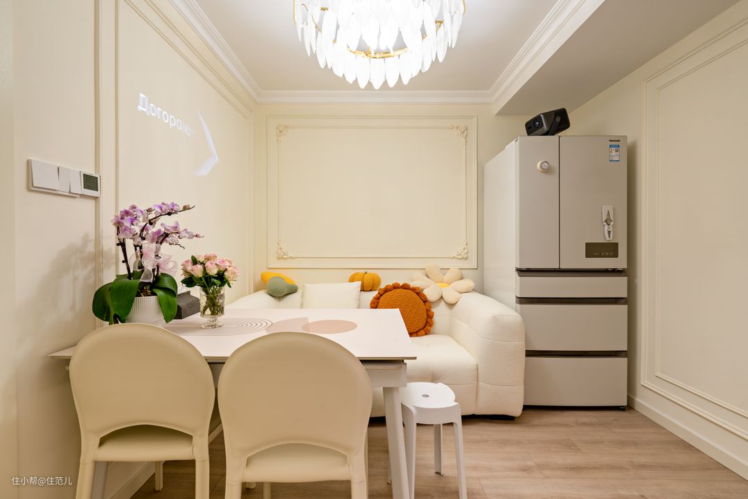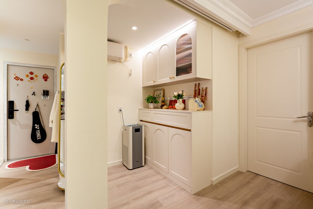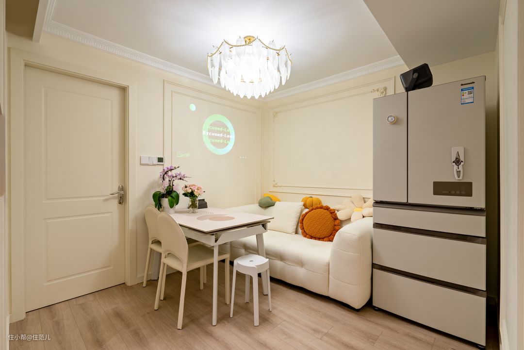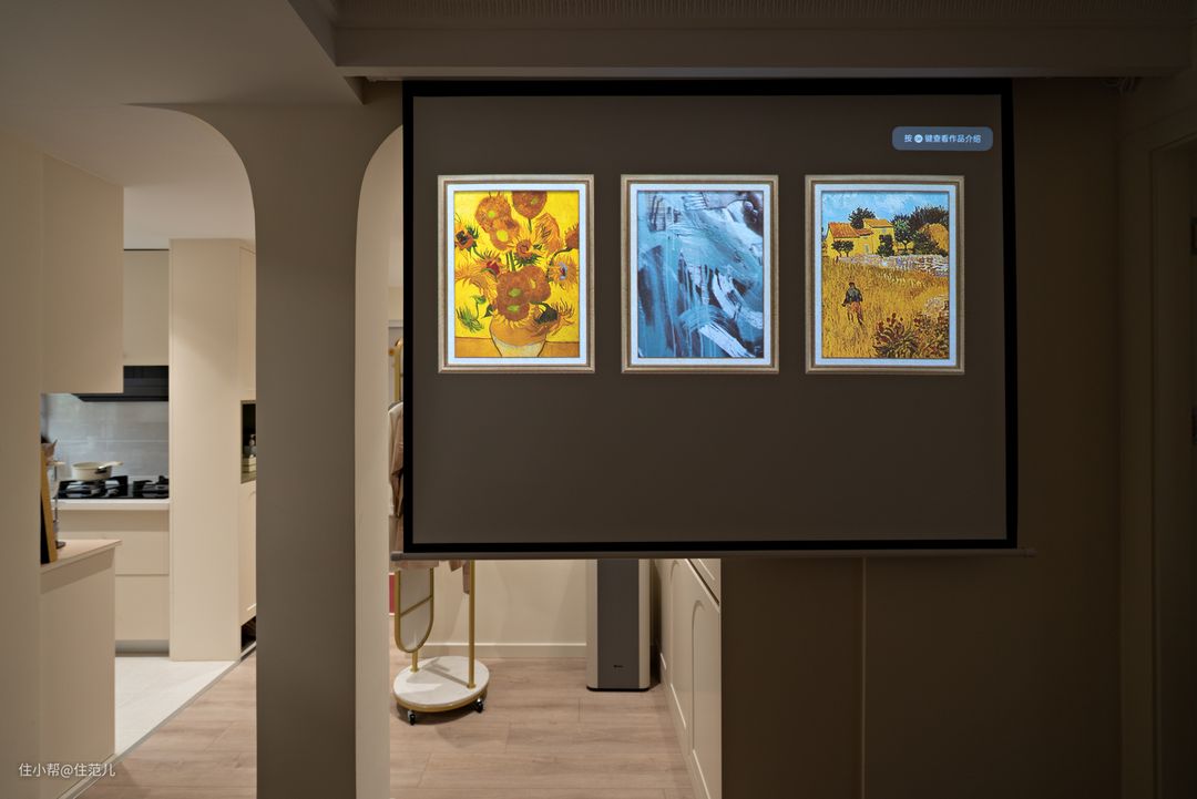 餐厅对面正对着的,就是以承重柱为中心的客餐厅,承重柱动是肯定不能动的,就看能怎么用。 设计师的解决方案是“弱化+再利用”。这点是基于屋主之前说希望家里暖点,延伸而来。 能营造暖的氛围,一是墙面颜色,要暖还不能显小,暖白是最好的选择,搭配弧形元素能带来弱化空间的感觉,客厅就成了接近“暖呼呼的法式风”。 定制柜柜门选择“拱形元素”、客厅背景墙面选用PU线条塑造“复古花型”、包括沙发选用圆乎乎的白色,都是希望在细节上能呼应客厅的整体法式氛围。 在这样细节的营造下,这面承重柱就得到一定程度的弱化,搭配前期提前暗藏了投影仪幕布。 看电影放下来幕布时,柱子到沙发的距离刚好2.5m,形成了一个很合适又相对密闭的“双人观影区”,体感很好。 Jessica说她觉得这样刚刚好,跳操、陪儿子看动画都很容易“沉浸下来”,太大反而显得空荡。