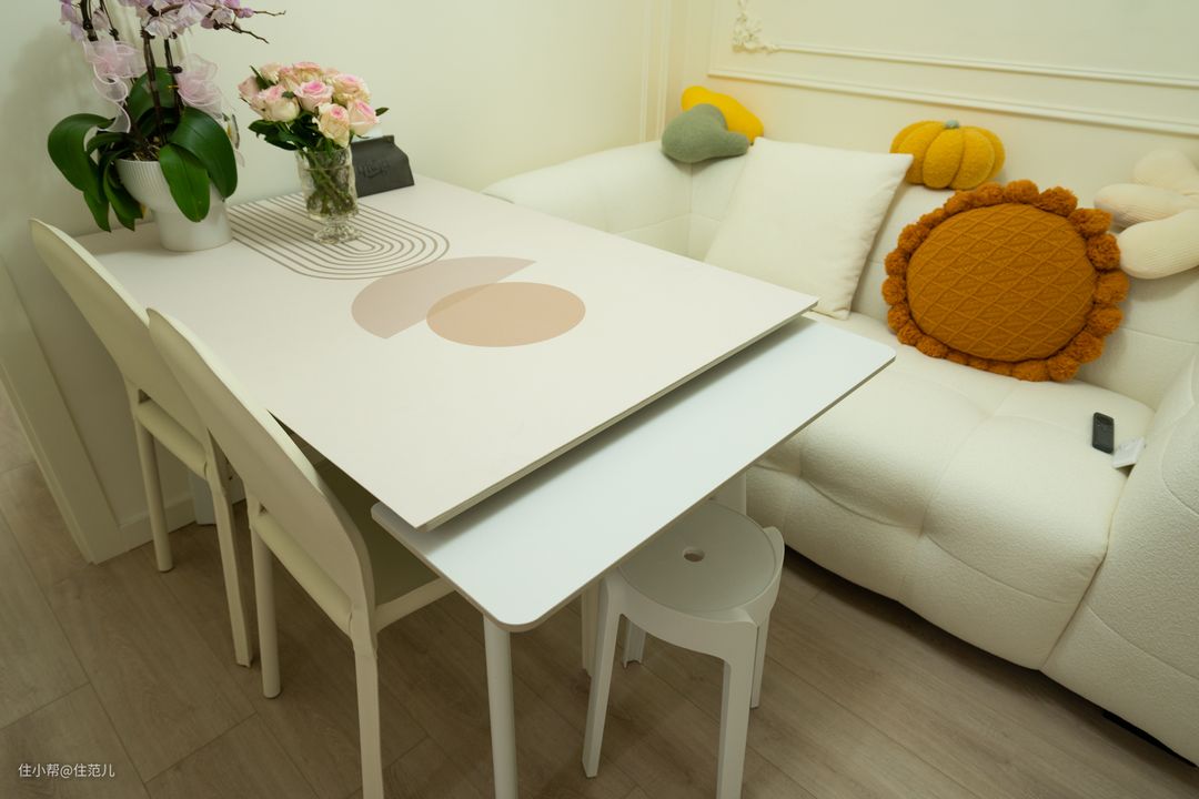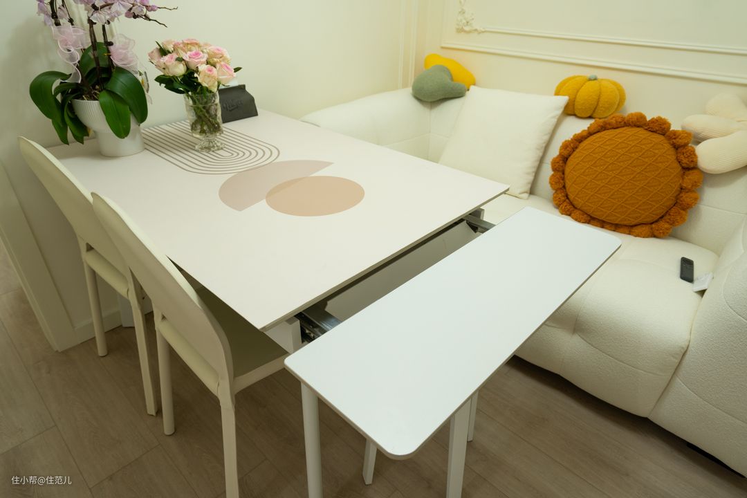 餐桌本身是网购的,正常容纳5个人,考虑到父母偶尔也来吃饭,左边两边都可延伸扩大桌面面积,方便放菜。