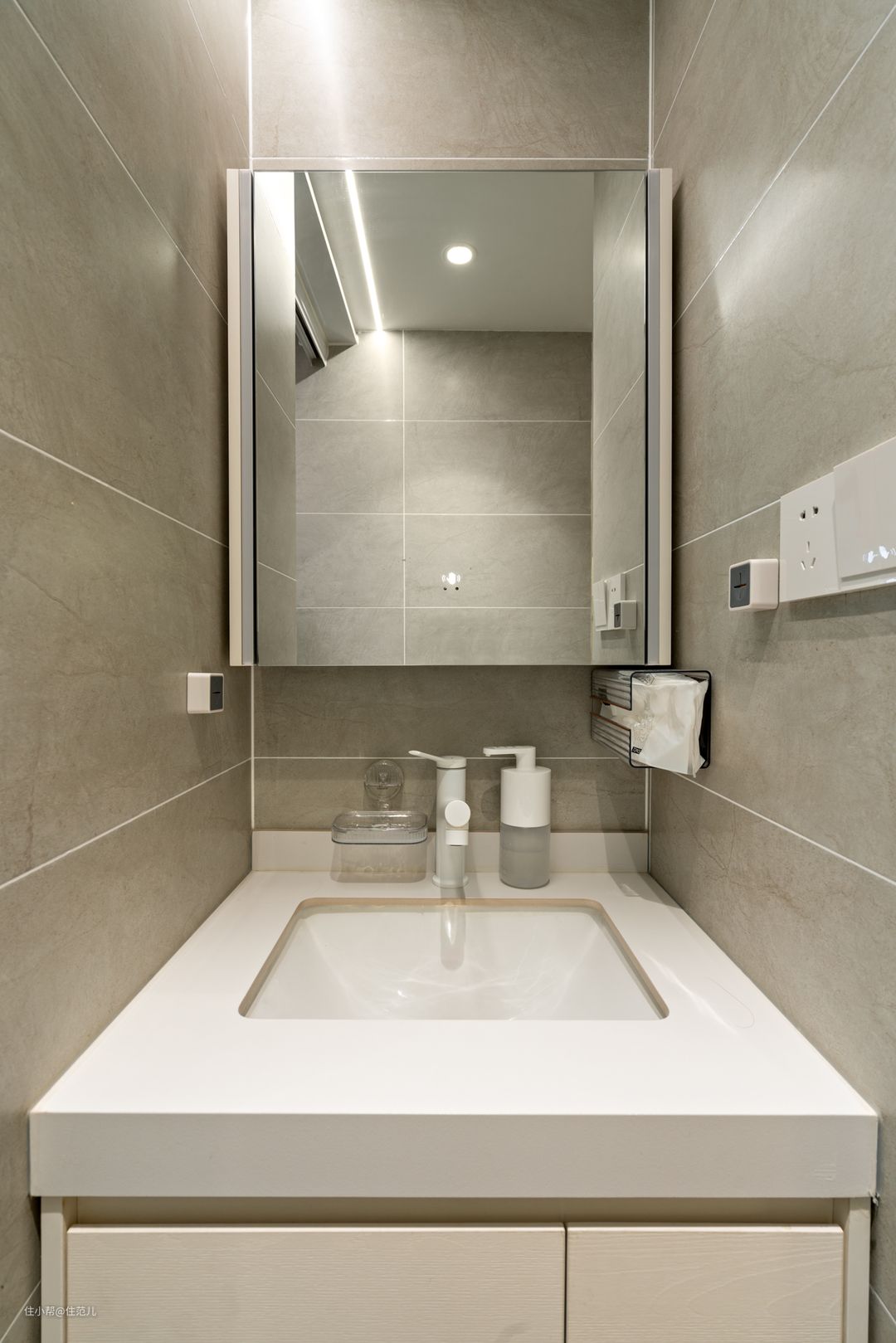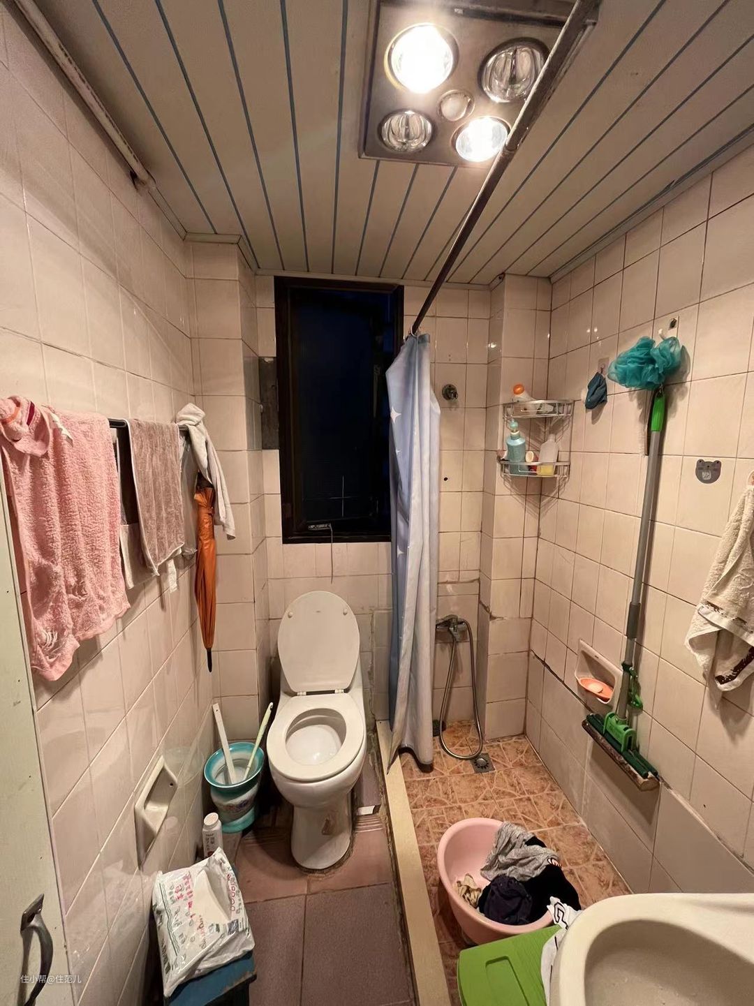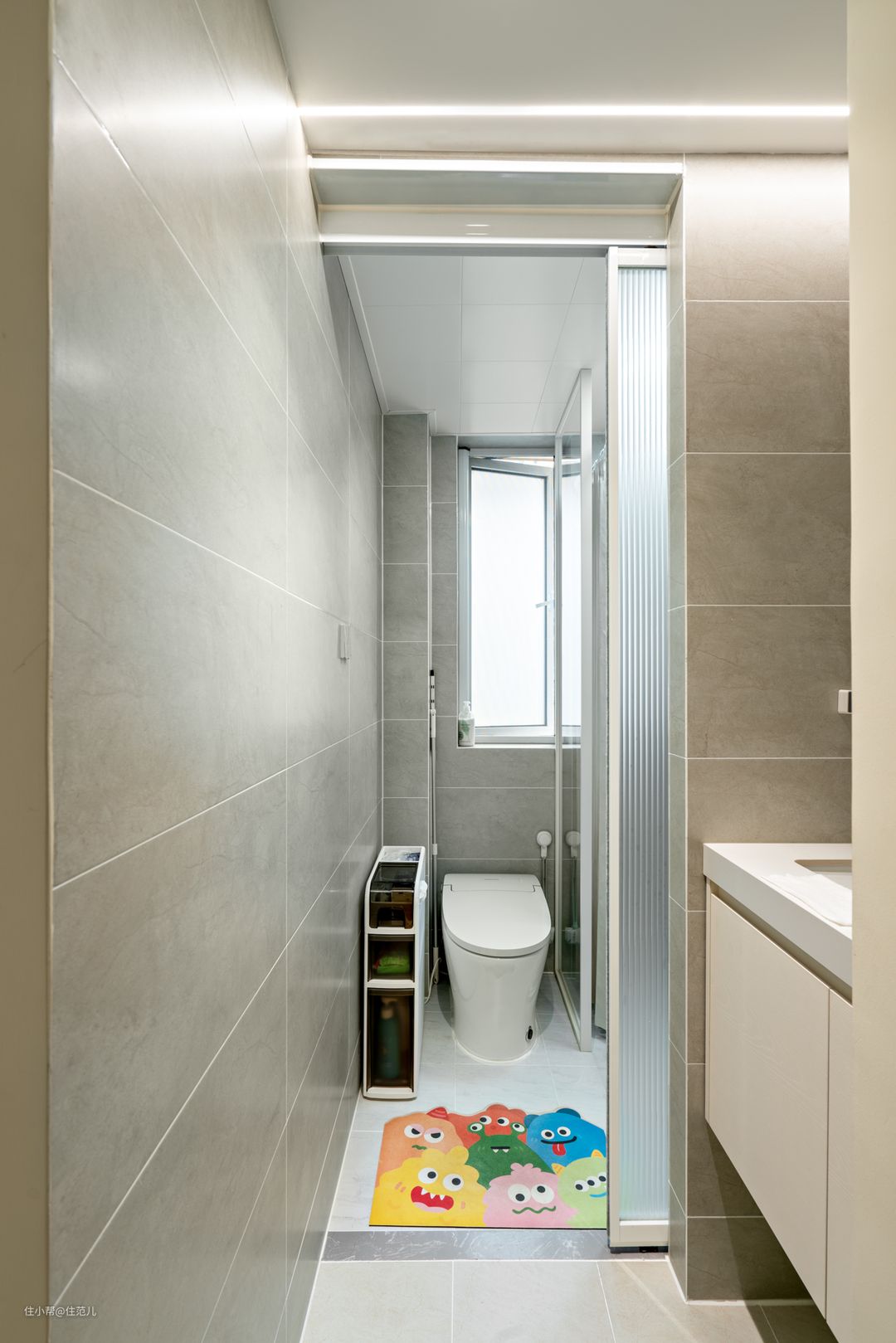 改造前VS改造后 空间再小,卫生间的“干湿三分离”不能少!玄关进门右手边,就是卫生间。 卫生间的位置并没有改动,动的是让功能布局更符合现代多种生活场景,省时卫生。 别看改前改后只多了这堵墙,牺牲了原有一半的淋浴区域,带来的方便就显而易见。 淋浴、马桶这等隐私的动作可关门独立完成;进门、出门随时洗手也可随时独立进行,两个互不打扰亦可同时进行。 台盆外置这个需求,自从干湿分离出现后,并不少见。 只是屋主强烈要求台盆外置,很大的点还是基于“疫情后遗症的选择”,洗手这件事的重要层级也被一再重视。 以后,这个需求会越来越常规。 隐私区域与洗手区之间通过一扇双层长虹玻璃门隔开,为了避免有人影的尴尬, 设计师还在内部吊顶叠加了一层拉帘,三层保护,也不会让上厕所的人有“心理障碍”。 jessica说,设计师挺细心的,原本她觉得是个多余没必要的,但对于来家里玩的朋友,是个很好的心理保护。 里面的马桶区和干区很小,加起来不过2㎡,很局促。 但你观察不到的是,淋浴区其实是个下沉式淋浴房,高点与低点之间高度差约有2cm,这让下水很快。 马桶区旁边收纳面积不够,jessica就网购了一个极窄的三层置物柜,放些纸巾、姨妈巾、还有厕所的清厕灵都刚好够用。