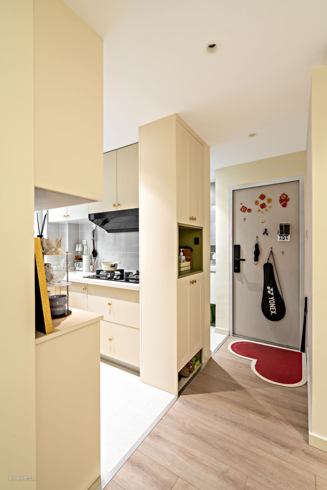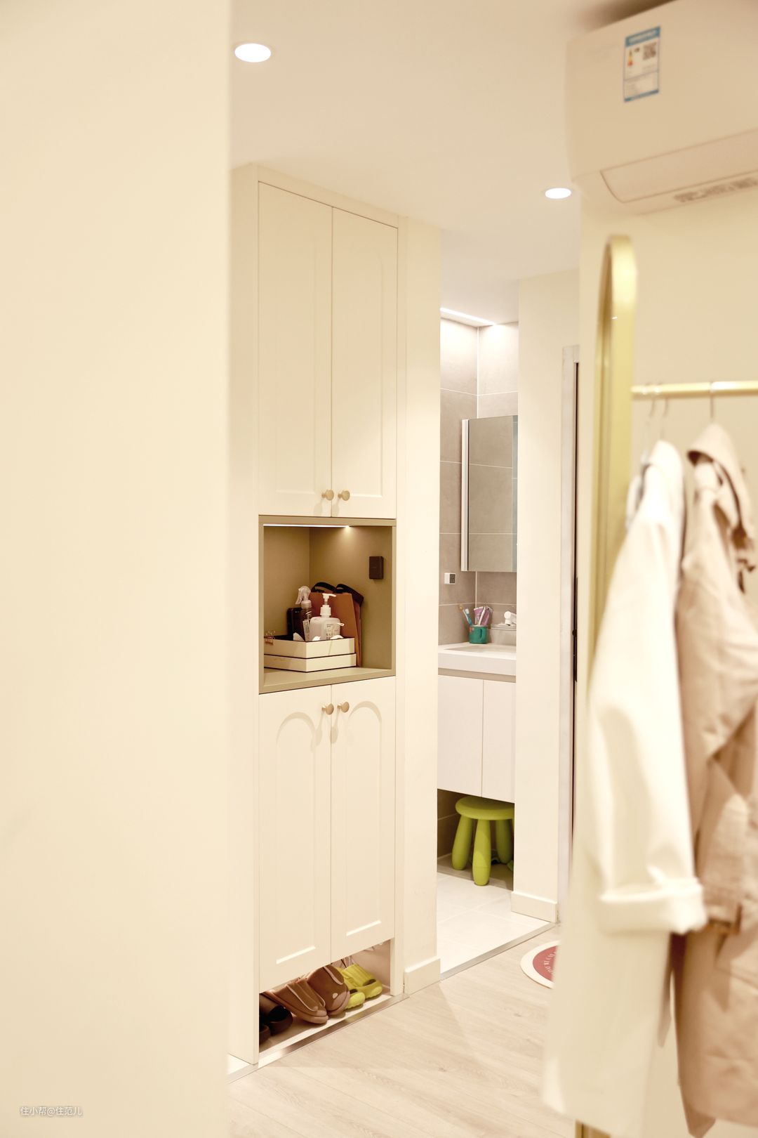 改造前是老式上海设计,一进门顶上用来放杂物,走线,没有真正的玄关,就是鞋架零散的放在地上。 90年代流行的小白砖,也在墙面出现。 改造后,玄关、走廊、厨房甚至到餐边柜附近的20㎡,全部做了防水石膏板吊顶。 虽然层高降低至2.3m了,因为石膏板吊顶的整体性,1.6m的我实体感觉上没有太大影响,但身高1.75m的jessica还是觉得有很大影响的,所以在她最喜欢窝着的客厅区域,就没做吊顶了。 玄关+走廊的面积实际不过1.5㎡,设计师顾莉莉借助原有厨卫墙体的部分,延伸出35cm轻体墙,才有了2㎡“专属的玄关柜”。 加上防盗门后2㎡可作为悬挂区域,当下的收纳、小物件才有了容身之处。 至于常穿外套的收纳,Jessica在某宝选购了一件灵活的金属晾衣架就足够,放在餐边柜对面,承重柱旁边,刚好可以形成一个软隔断。 我们采访时,jessica已入住半年了,就她和宝宝两人的衣物,当下这些面积她觉得够用了。 如果说未来实在不够用,晾衣架背后餐边柜的部分区域,就是plan B。 这就是我说“灵活的玄关”来源,可以根据个人需求随时调整使用方向,因为面积不大,也就是三两步的事情。 从主卧、次卧出来刚好穿衣、穿鞋,必经之路完成这些动作,动线也很方便。