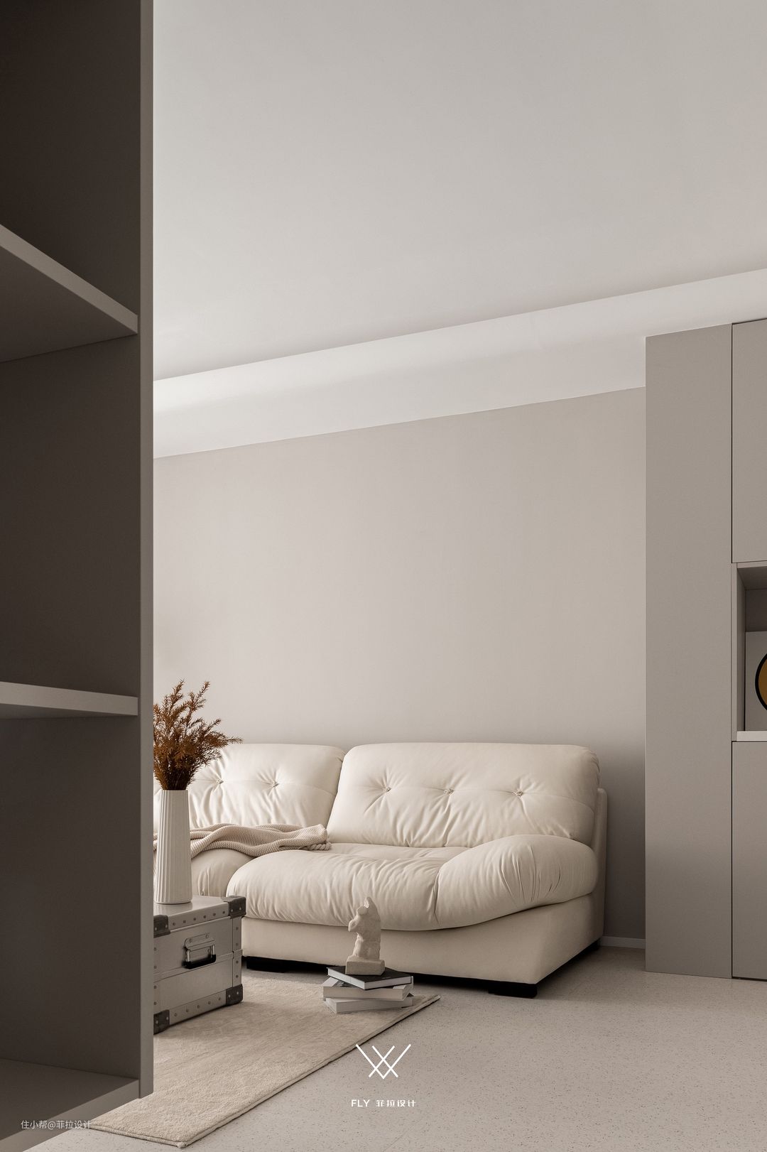 因为是刚需房,对于面积来说肯定是希望尽可能地都给充分利用起来,所以我们把朝南的所有阳台都包了进来,邻着客厅的阳台自然被纳入客厅,让原本看着略显局促的公共空间瞬间通透、敞亮了起来,深化了南北通透的效果。 阳台包入客厅之后,还是有承重墙存在,卡在客厅与阳台之间,为了加强视觉美感,希望改造后的阳台与客厅之间是融洽一体的,我们在右侧沙发背景墙邻着的阳台承重墙位置,做了一个曲面的衔接造型,既有着线条本身的柔软美感,又让阳台和客厅之间的融合更自然。在顶面对于风口,还有整个顶面的造型我们也做了处理,打造每一个面的细节,都为呈现最好的空间氛围。 刚需的家,再加上有了小宝宝,对收纳的高需求是无需多言的。我们在电视背景墙这块做的是一整面收纳柜体,中间留白一部分做电视的内嵌处理,柜体的下面不接地,悬浮状的处理既满足了高收纳的需求,又尽量不让客厅的面积看着被压缩,让家里面尽量呈现空间的轻盈感。 从主卧门看向客厅,可以看到最左边电视墙柜体没有全封闭,做了一个侧边格口柜,这个小细节可别小看它,既有弱化大面积柜体膨胀的效果,客厅也有了他们喜欢的物件摆放展示的空间。 窗帘选择的款很是简单大方,是公共空间一个很好的背景——干净、纯粹,有节律感,和室外景色的搭配呈现也很有意境。 从主卧门看向客餐厅角度,在餐厅一侧靠墙位置做了一组餐边柜,与客厅相接,增强空间收纳。